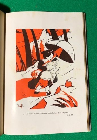 In 4°; 79, (3) pp. e 4 c. di tav. fuori testo in rosso e nero. Dedica vecchia alla prima carta. Piatti interni foderati con bellissima carta editoriale a motivi azzurri e rossi con marca tipografica della casa editrice La Prora. Numerose illustrazioni nel testo, anche a piena pagina. Prima ed unica rara edizione, due soli esemplari censiti in ICCU, di questo libro per ragazzi. Alcuni lievi difetti alla copertina, alcune leggerissime fioriture in poche pagine e nel complesso in buone condizioni di conservazione. Rif. Bibl.: IT\ICCU\UBO\3035049.