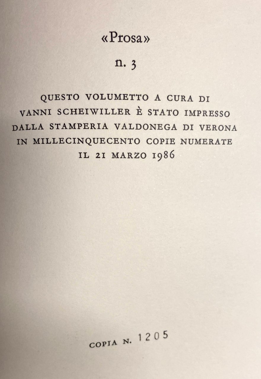 - QUESTO VOLUMETTO A CURA DI VANNI SCHEIWILLER È STATO IMPRESSO DALLA STAMPERIA VALDONEGA DI VERONA IN MILLECINQUECENTO COPIE NUMERATE IL 21 MARZO 1986