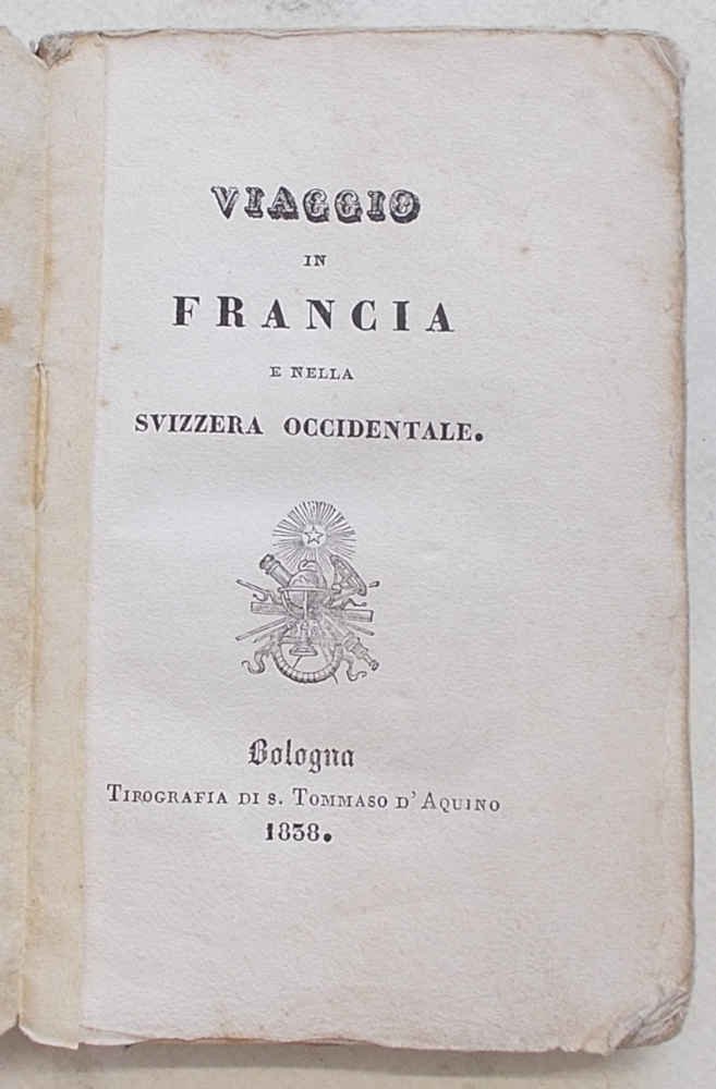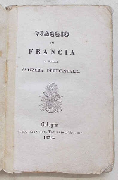 In 24° (cm. 14,5 x 9,5); pagg. 252; bross. muta. antica. Esemplare a pieni margini, non rifilato. VG-. ** Lo stampatore spiega: "Traducemmo quanto di meglio scrissero Dumas e Janin. Dov'essi mancavano vi aggiungemmo del nostro". Da Chalons a Lione. Le strade di ferro (Nota: le ferrovie per S.Etienne). Le miniere di carbon fossile. Viaggio a Ginevra. Losanna. Le saline di Bex. Il beefsteak d'orso (Nota: Martigny).