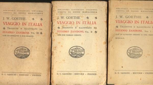SANSONI, 1947, s.d. (anni '40). In 16° di pp. XII-267-242-290. Bross. edit. TRADOTTO E ILLUSTRATO DA EUGENIO ZANIBONI. In ap. di libro ritratti di A. Kauffmann della Duchessa di Girasole (vol. 1); a doppia pagina aperta Il porto di Napoli, disegno inedito di Kniep (vol. 2); ritratto di Goethe di A. Kauffmann (vol. 3). (Narrativa). BUONO stato, con naturali segni del tempo.