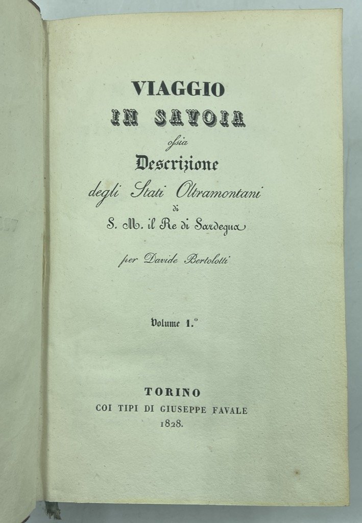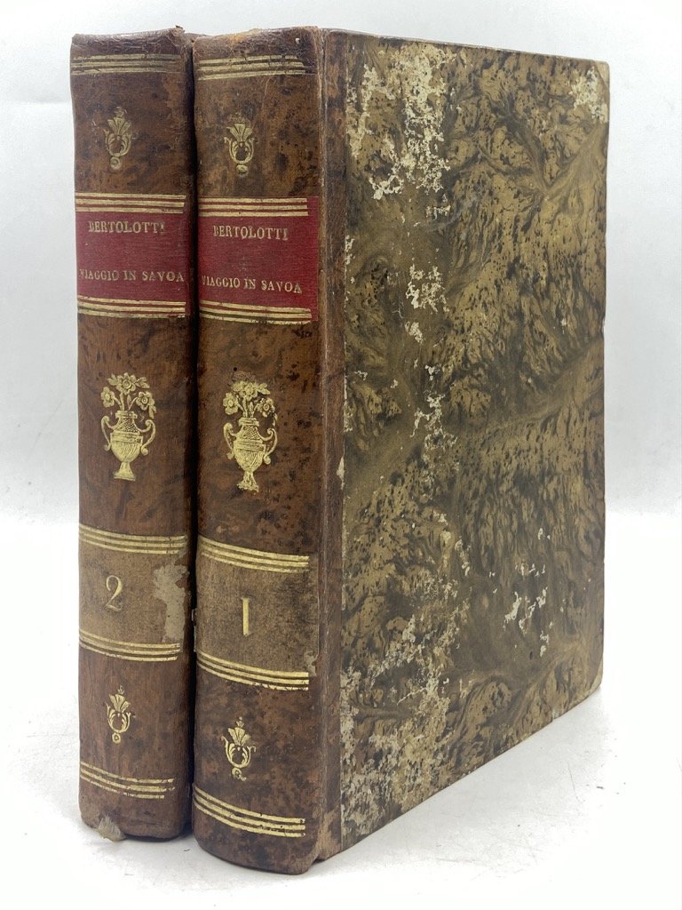 Due volumi in ottavo, cm 20 x 13.5, in legatura coeva in mezza pelle con piatti in carta marmorizzata e dorsi lisci con fregi e titoli dorati, pp (4) (8) XVI 324, (2) 275 (1). Manca l’occhietto del secondo volume, peraltro buon esemplare; qualche imprecisione e segno d’uso sulle legature. Dopo l’esperienza milanese che aveva dato origine alle Peregrinazioni e al Viaggio ai tre laghi, Bertolotti trascorse un periodo in Toscana, dove preparò una mai pubblicata opera per descriverne le contrade, prima di trasferirsi a Torino ove «anche in virtù del successo conseguito con le proprie pubblicazioni di argomento ‘lombardo’ ottenne dal Ministro degli Interni dei Savoia, Gaspard-Jerôme Roget conte di Cholex, l’incarico di redigere una descrizione ufficiale delle regioni del Regno sardo» (Necchi), progetto che si concretizzò nel 1828 in questo Viaggio in Savoia, e, più tardi, in quello nella Liguria marittima. Nel Viaggio in Savoia lo stile di Bertolotti inizia ad asciugarsi, spostandosi dal diario di viaggio alla guida vera e propria, con descrizioni «il più possibile oggettive ed essenziali» (Barena), senza comunque perdere del tutto il carattere eclettico e composito proprio delle sue opere. Le LXIX lettere descrivono l’itinerario percorso dall’autore l’estate 1827 nelle terre transalpine del Regno di Sardegna, dal passaggio del Piccolo San Bernardo al rientro attraverso il Moncenisio, soffermandosi estesamente (capitoli XXX-XXXVIII) su Chamonix e il Monte Bianco, ripercorrendone la storia alpinistica e narrando in dettaglio il «Salimento di due inglesi», Edmund Clarke e Markham Sherwill, nel 1825. Numerose le notizie sulle fonti e i bagni, le miniere, le rovine archeologiche e medievali, che fungono da spunto al racconto di leggende ed episodi storici legati alla casa sabauda, ecc; in calce, alcune tabelle con l’analisi delle acque termali e solforose (La Perrière, Saint-Gervais, Évian, Cachat, Aix-les- bains, Échaillon) e una con un quadro statistico demografico. L’opera ebbe un immediato successo, conoscendo oltre a questa originale altre due edizioni nello stesso anno, l’ultima delle quali illustrata. L’esemplare qui proposto si distingue per la presenza di un «Manifesto» degli Editori, composto da 4 carte non numerate legate dopo il frontespizio e sconosciuto ad ogni repertorio o bibliografia consultata; in questo breve testo gli editori segnalano i consigli e gli aiuti concessi all’autore dal recentemente scomparso «Eccelso Personaggio» (il conte di Cholex), notano le qualità dell’opera e ne indicano i concessionari a Torino e Milano. Raro e ricercato. Rean, p. 67, cita la seconda edizione; Lozzi II, 4915: «Opera assai pregiata e non comune»; Perret, 441: «Récit de voyage en Tarentaise, à Annecy, Aix-les- Bains. Chambéry, au Mont Blanc.Rare»; Clerici 1999, 401; Angelini, 0620; Noussan-Peyrot, II.29; Garimoldi-Recalcati, 96.