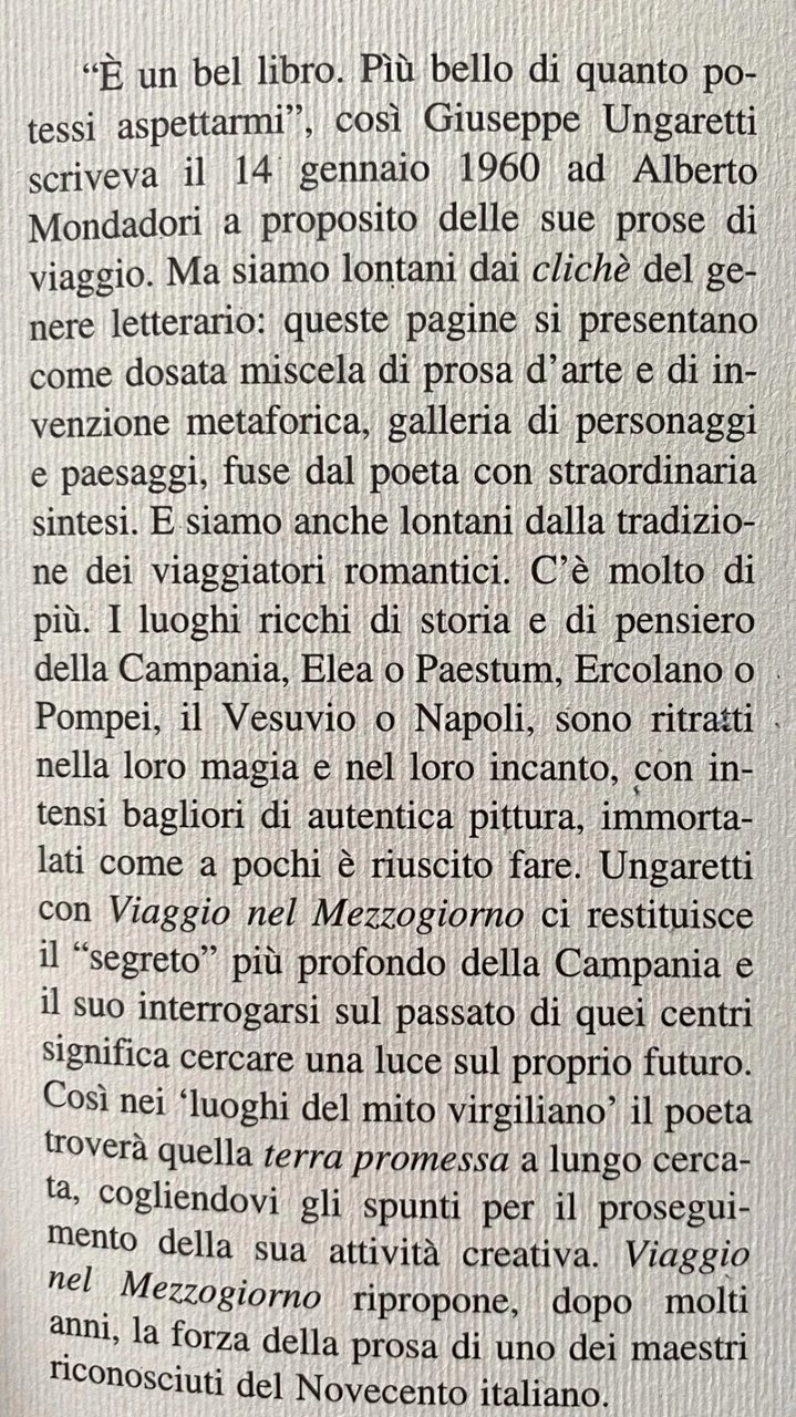 "È un bel libro. Più bello di quanto potessi aspettarmi", così Giuseppe Ungaretti scriveva il 14 gennaio 1960 ad Alberto Mondadori a proposito delle sue prose di viaggio. Ma siamo lontani dai cliché del genere letterario: queste pagine si presentano come dosata miscela di prosa d'arte e di invenzione metaforica, galleria di personaggi e paesaggi, fuse dal poeta con straordinaria sintesi. E siamo anche lontani dalla tradizione dei viaggiatori romantici. C'è molto di più. I luoghi ricchi di storia e di pensiero della Campania, Elea o Paestum, Ercolano o Pompei, il Vesuvio o Napoli, sono ritratti nella loro magia e nel loro incanto, con intensi bagliori di autentica pittura, immortalati come a pochi è riuscito fare. Ungaretti con Viaggio nel Mezzogiorno ci restituisce il "segreto" più profondo della Campania e il suo interrogarsi sul passato di quei centri significa cercare una luce sul proprio futuro. Così nei luoghi del mito virgiliano' il poeta troverà quella terra promessa a lungo cercata, cogliendovi gli spunti per il proseguimento della sua attività creativa. Viaggio nel Mezzogiorno ripropone, dopo molti anni, la forza della prosa di uno dei maestri riconosciuti del Novecento italiano.