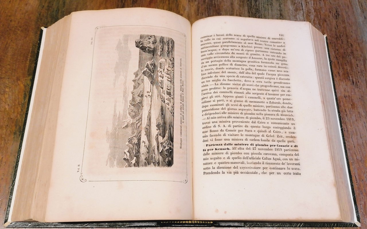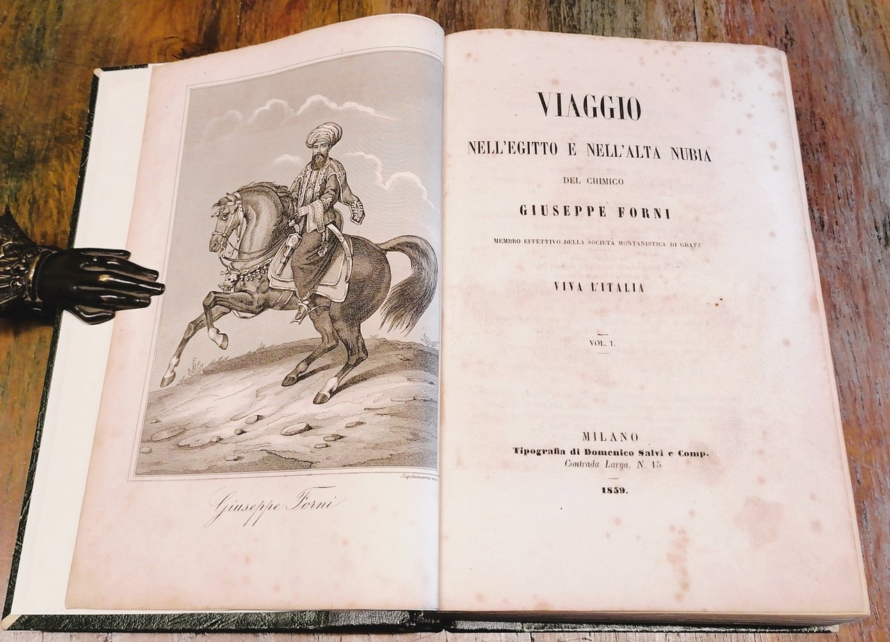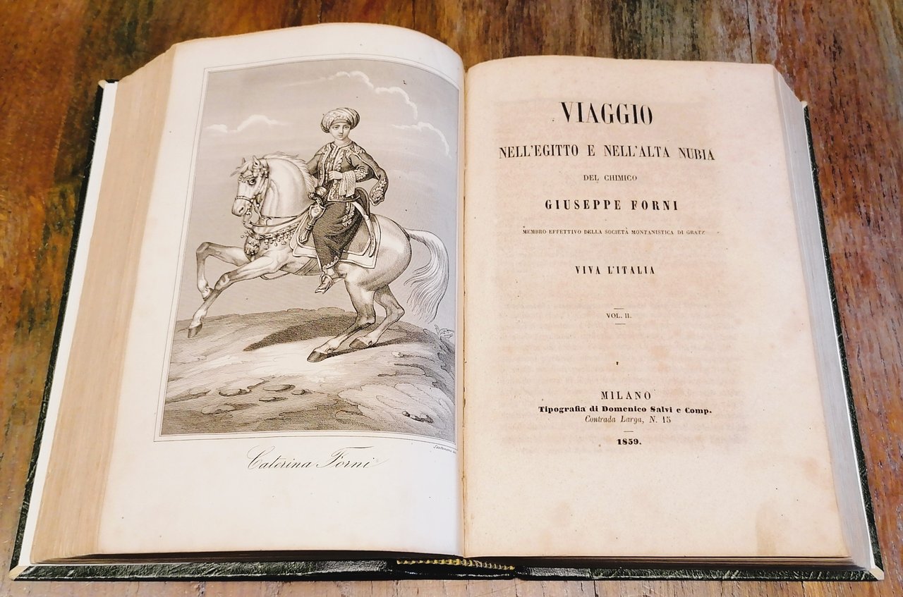 Due volumi riuniti in un tomo in 8°, legatura novecentesca in mezza pelle color testa di moro con titoli, filetti e fregi impressi in oro al dorso, carta decorata a fondo verde ai piatti, pp. (4),512, con in antiporta una tavola incisa in acciaio da Santamaria con ritratto di Giuseppe Forni e due tavole fuori testo (ritratti di Mohammed Alì, Viceré d'Egitto e di Ibrahim Pascià) ; (2),635, con in antiporta una tavola incisa in acciaio da Santamaria con ritratto di Caterina Forni e due tavole fuori testo (due vedute delle montagne contenenti miniere di solfuro di piombo, situate nella pianura di Abureich). Le incisioni in antiporta ritraggono Giuseppe Forni e la moglie Caterina a cavallo e vestiti all'orientale. Chiudono tutti i capitoli diversi finalini tipografici ornati. Prefazione di P. Giovanni Josti. Alcune tracce di ossidazione all'interno, ma volume solido e ben conservato.
