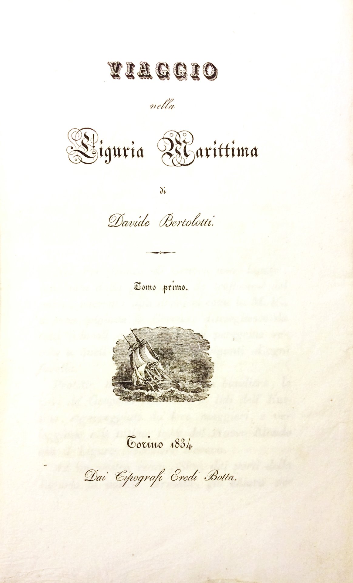 In-8 p. (mm. 218x136), 3 volumi, brossura editoriale, pp. 444; 374; 304; "manca" come in quasi tutti gli esemplari la carta geografica.Raccontato in forma epistolare, questo viaggio dalla Costa Azzurra e lungo tutta la Riviera ligure è particolarmente interessante per le accurate descrizioni dei luoghi, della popolazione, dei prodotti della terra, della navigazione, dei monumenti antichi e delle opere d'arte moderna.Con il primo volume l'A. prende avvio da Nizza e via Monaco, Mentone, Ventimiglia, S. Remo, Oneglia, Albenga, Savona, Voltri, arriva a Sampierdarena. Il secondo è interamente dedicato alla storia di Genova (navale, commerciale, militare e artistica) e il terzo alla Riviera di Levante (dalla valle del Bisagno a La Spezia, Sarzana e Luni). "Edizione originale" di quest'opera composta in tre anni di residenza a Genova. Il torinese Davide Bertolotti (1784-1860) si era trasferito, nel 1812, nella capitale lombarda lavorando per editori locali e nel '14 cominciava a dirigere lo "Spettatore". L'attività di poligrafo del B. si andava estendendo: nel 1817 iniziò la serie dei suoi fortunati racconti di viaggi in Lombardia; dal 1818 al 1834 stampò e diresse un nuovo periodico (il "Ricoglitore", poi, dal 1824, il "Nuovo Ricoglitore"), ispirato sempre a intenti di divulgazione culturale, per cui si valse largamente di notizie e di opere straniere. Nella sua attività non trascurò versi, novelle, romanzi avventurosi e sentimentali, secondo il gusto del tempo; e fu tra i primi autori di romanzi storici... Così Diz. Biogr. Italiani,IX, pp. 613-615. Esemplare con barbe, ben conservato.