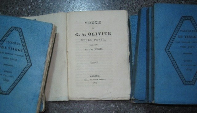 8 tomi in-16° (140x95mm) pp. 180, 198, 200, 192, 191 (1), 214, 224, 171 (1); legati in in tre volumi in mezza pelle coeva con titoli e tomaisons dorate su tasselli ai dorsi. Più che buon esemplare. Prima edizione torinese, nella 'Raccolta di Viaggi' (tomi XXXII-XXXIX) del Voyage dans l'Empire Ottoman, l'Egypte et la Perse (Parigi, 1807), importante resoconto di viaggio in Persia e Medio Oriente del celebre entomologo Olivier (Les Arcs-sur-Argens, Tolone, 1756-Lione, 1814), ricchissimo di osservazioni di ogni sorta sulle località ed i popoli incontrati nell'itinerario. Il naturalista francese, già celebre per i suoi studi sui coleotteri e sui ragni, compì tale viaggio dal 1792 al 1798, raccogliendo in loco numerosissimi campioni entomologici, oggi conservati presso il Museo di Storia Naturale di Parigi.