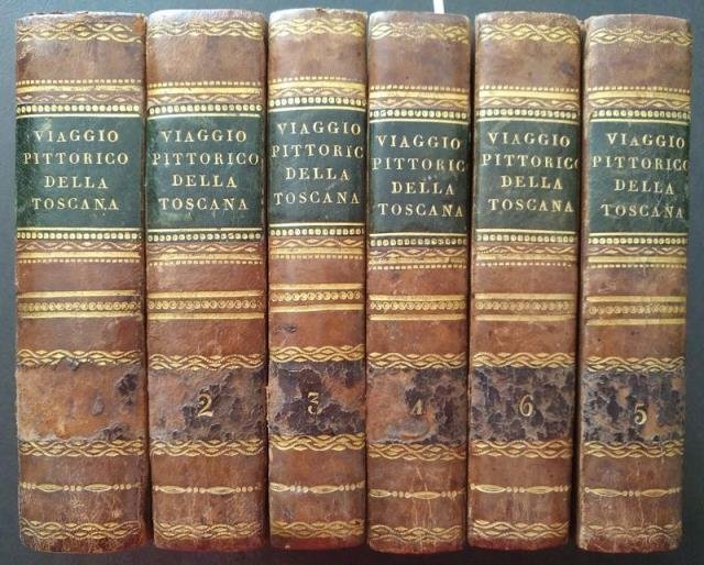Vincenzo Batelli e Comp., Firenze 1827. Terza edizione. Sei voll. in 12esimo, pp. XX, 365 (con Indice degli Artisti); 338, XII, III (Indice delle Vedute); 284, III (Indice delle Vedute); 283, III (Indice delle Vedute); 310, III; 298, XI (Avvertimento ai Lettori e Indice delle vedute). Vincenzo Batelli e Comp., Firenze 1827. Terza edizione. Sei voll. in 12esimo, pp. XX, 365 (con Indice degli Artisti); 338, XII, III (Indice delle Vedute); 284, III (Indice delle Vedute); 283, III (Indice delle Vedute); 310, III; 298, XI (Avvertimento ai Lettori e Indice delle vedute). A inizio di ciascun volume è presente una incisione (nel primo volume, in antiporta, è il ritratto dell’Abate Francesco Fontani, alla quale segue la “Carta della Toscana”, unica carta contenuta nell’opera a fronte di tutte le altre che sono vedute; nei successivi volumi, sempre a inizio volume, ci sono vedutine di città) + 4 piante rip. in b/n f. t. delle città di Firenze, Pisa, Siena e Livorno + moltissime incisioni in rame all'acquaforte in b/n f. t. all'interno dei sei volumi (si tratta di un'opera munita di un eccezionale apparato iconografico che illustra tutte le città della Toscana e luoghi secondari di essa; la collazione degli esemplari è sempre variabile e porta a un numero di tavole spesso diverso ma che è di circa 220), leg. orig. in mz. pelle marrone con titolo su tassello nero, filetti dorati al dorso, piatti in cartone marmorizz. giallo / marrone. Opera basilare per la storiografia della Toscana, importante e rara a reperirsi completa dei volumi e delle tavole. Usuali mende alle legature con leggera usura nella parte inferiore dei dorsi, freschi e marginosi gli interni con tavole ben impresse e pulite. .