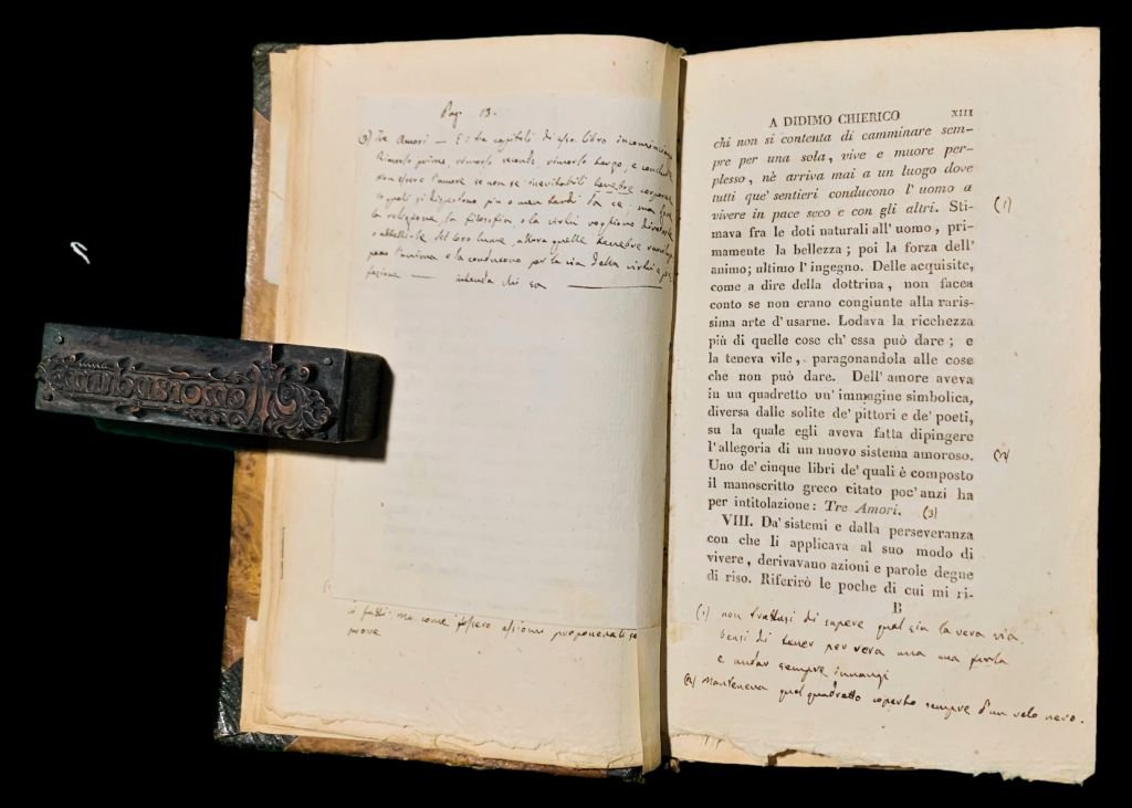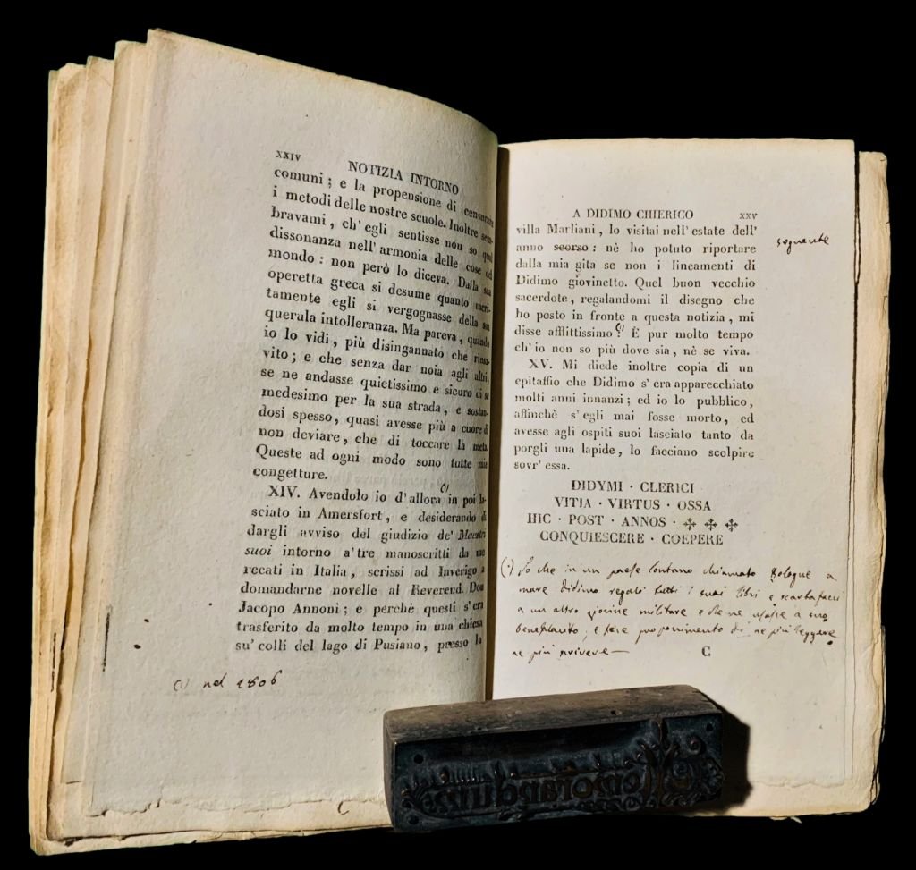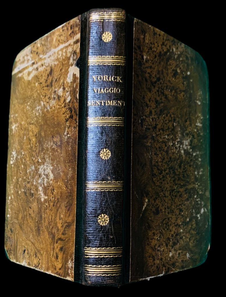 In 8° (16,8x10 cm); XXV, (1), 249, (1) pp. e due c. di tav. fuori testo con ritratti di Sterne e Didimo Chierico, aggiunte intercalate nel testo 2 carte fittamente manoscritte. Legatura coeva in mezza-pelle verde con titolo e ricchi fregi in oro al dorso. Piatti foderati con carta coeva. Due carte presentano, a causa di un difetto della carta antecedente la stampa, una mancanza di carta al margine esterno, lontano dal testo, ininfluente. Vecchia firma di possesso al margine alto del frontespizio. Alcune pagine leggerissimamente ed uniformemente brunite, ininfluente e nel complesso in buone-ottime condizioni di conservazione. Esemplare arricchito, nella Notizia intorno a Didimo Chierico di numerosissime aggiunte chiosate da fine mano coeva, sia nel testo che su due carte aggiunte, che sembrano seguire le correzioni che sarebbero poi apparse, nell'edizione definitiva dell'opera edita alcuni anni dopo. Terza edizione, dopo le due edizioni del 1813 (stampate, rispettivamente da Molini e Didot) della più celebre traduzione del Viaggio Sentimentale di Sterne, opera del grande poeta, scrittore, drammaturgo, traduttore e critico letterario italiano, fra i principali esponenti del neoclassicismo e del preromanticismo, Ugo Foscolo, nato Niccolò Foscolo (Zacinto, 6 febbraio 1778 Londra, 10 settembre 1827). L'edizione presenta l'originale scritto foscolianoNotizia intorno a Didimo Chierico, fantomatico traduttore dell'opera ed alter-ego letterario di Foscolo che rappresenta una geniale trovata letteraria di Foscolo che immagina una conversazione fra di lui e Didimo Chieirco che gli racconta alcuni fatti salienti della sua vita e della poetica del traduttore. Lopera, in questa edizione, è introdotta da un avvertimento ai Lettori e da una Notizia intorno a Didimo. Non è presente, invece, la prefazione Didimo Chierico a lettori salute, inclusa nelloriginale del 1813, probabilmente, su idea dello stesso Foscolo. La traduzione foscoliana di A sentimental Journey through France and Italy, pubblicato incompiuto nel 1768 sotto lo pseudonimo shakespeariano di Yorick, un mese prima della morte di Sterne, rappresenta la seconda traduzione italiana dell'opera, dopo la prima apparsa a Venezia, edita da Zatta nel 1792. L'opera di Sterne è una fine e dotta satira dei viaggi del Grand Tour nella quale l'autore riprende e rielabora il classico racconto di viaggio. Data la presenza di Foscolo a Venezia nel 1793, è probabile che fu proprio su questa traduzione edita da Zatta che Foscolo si avvicinò all'opera di Sterne, valutandone, probabilmente anche alcune pecche. Si sa con sicurezza che Foscolo iniziò a lavorare alla traduzione del Viaggio sentimentale già dal 1805 anche se riprese più volte in mano la traduzione cercando, non solo di seguire lo stile di Sterne riportandolo nella lingua italiana, ma ancor di più di interpretare il pensiero dell'autore irlandese. Scrive Mario Scotti, nella voce da lui curata dedicata a Ugo Foscolo, Dizionario Biografico degli Italiani - Volume 49 (Treccani 1997): "Nella seconda metà di ottobre il F. si trasferì in una casa presso al parco delle Cascine e all'Arno. Le sue condizioni di salute non erano buone: nondimeno attendeva tutti i giorni al lavoro letterario almeno per qualche ora. Aveva revisionato la traduzione del Viaggio sentimentale dello Sterne ed era pronto a stamparla: ma poi tornò a sottoporla ancora per tutto l'inverno a correzioni e rifacimenti; accantonate le Grazie, cui aveva cominciato ad attendere appena giunto a Firenze, era tutto preso dalla tragedia Ricciarda, di cui al trasferirsi nel nuovo alloggio aveva già steso il primo atto. Con la primavera 1813 si trasferì a Bellosguardo. Seguirono mesi di serenità spirituale e di felice attività poetica. Pure le vicende politiche e militari di quello che sarebbe stato il tramonto dell'età napoleonica non gli restavano indifferenti ed estranee. Riferimenti continui alla campagna di Russia si incontrano sin dai primi frammenti delle Grazie. Le notizie dal fronte giungevano con ritardo, ma infine si vennero precisando le dimensioni del disastro. Degli amici del F. perirono durante la ritirata il colonnello G. Battaglia (per la sua vedova, Lucietta Frapolli, il poeta sarebbe stato preso da una forte passione), C.D. Del Fante, B. Giovio. Da aprile a luglio il F. continuò ad attendere alle Grazie, mentre in contemporanea lavorava alla Ricciarda, gettava giù l'abbozzo di un nuovo Edipo, meditava un'altra tragedia, Bibli e Cauno - ispirata a un episodio delle Metamorfosi ovidiane -, componeva i capitoli A Pietro Rottigni, A Leopoldo Cicognara, Al signor Zanetti. A giugno per i tipi dello stampatore Didot di Pisa vide luce la traduzione del Viaggio sentimentale di Yorick lungo la Francia e l'Italia. Alla traduzione seguiva la Notizia intorno a Didimo Chierico, personaggio immaginario sotto cui il F. nascondeva la propria identità, come lo Sterne aveva fatto con il personaggio shakespeariano. Il nome Didimo era probabilmente quello del grammatico alessandrino del primo secolo". Interessante esemplare arricchito da numerosissime note coeve in bella grafia leggibile. Rif. Bibl.: Cfr. Mazzolà,49 p. 65 il cui esempl. contiene la prefazione Didimo. a lettori salute ma precisa che secondo il Rabizzani. in questa ediz. manca tale prefazione. Non in Acchiappati, né Ottolini.