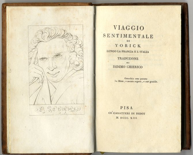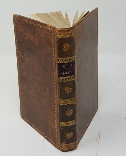 >in-16 pp.VIII,1,252,2. Con due ritratti incisi di Sterne e Didimo Chierico. Bella legatura coeva in piena pelle, titolo su tassello, cornice ai piatti. Manca il primo occhietto. Prima edizione di questa importante traduzione dell'opera di Sterne: la stampa fu in realtà eseguita a Firenze dal Molini nel 1813. Adottando un nom de plume (Didimo, come il grammatico alessandrino di età augustea, e Chierico, sinonimo di una figura di intellettuale isolato dalla mondanità), Ugo Foscolo traduce e annota il romanzo di Laurence Sterne, il quale "[...] assumendo il nome di “Yorick”, antico buffone tragico, volle con parecchi scritti, e singolarmente in questo libricciuolo, insegnarci a conoscere gli altri in noi stessi, e a sospirare ad un tempo e a sorridere meno orgogliosamente su le debolezze del prossimo". Dopo essersi identificato nella passionalità di Jacopo Ortis, il Foscolo, ormai profondamente disilluso nelle sue speranze di realizzazione dei suoi ideali, si costruisce un secondo alter ego, completamente opposto al primo. Ottimo esemplare assai fresco. acchiappati n 70 - Ottolini 225 - Mazzola 39