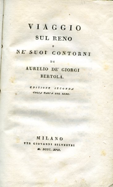 In-16°, pp. XLVI, (2), legatura t. tela verde con titolo in oro su tassello al dorso. Una carta incisa su rame e ripiegata f.t. del corso del Reno da Magonza a Düsseldorff. Precedono, alle pp. in nn. romani, delle notizie biografiche sul Bertola scritte da Pompilio Pizzetti. Sporadiche fioriture. Bell'esemplare. Seconda edizione di questo resoconto romantico di un viaggio in Germania, lungo il corso del Reno, nel 1787, narrato in forma epistolare alla marchesa Orintia Sacrati dal De Giorgi Bertola (Rimini, 1753-ivi, 1798), uno dei più noti letterati del nostro Settecento. 'Viaggi più lunghi lo portarono in Svizzera, dove conobbe il Gessner, e lungo la valle del Reno. [nel] Viaggio sul Reno e ne' suoi contorni. quei paesaggi stranieri, idillici e insieme esotici, forniscono all'autore, meglio che quelli napoletani e riminesi delle Lettere campestri, una occasione particolarmente idonea a svegliare la sua tenue ma genuina poesia della 'sensibilità' deliziosamente oscillante fra i diletti della contemplazione della natura pittoresca e quelli della meditazione teneramente malinconica.' (Emilio Bigi in D.B.I., IX). Il volume è il primo delle 'Opere scelte' del Bertola, all'interno della Biblioteca scelta di opere italiane antiche e moderne divisa in sei classi. Classe II - Prose. Gamba, 2543: 'Quadro di vivezza di colori animato e variato. Sono 46 lettere veramente ornate di fiori scientifici e letterarii'.