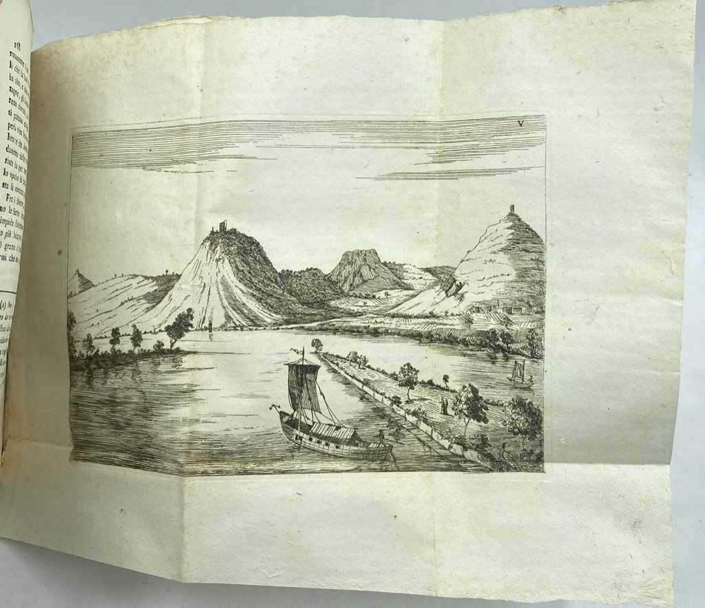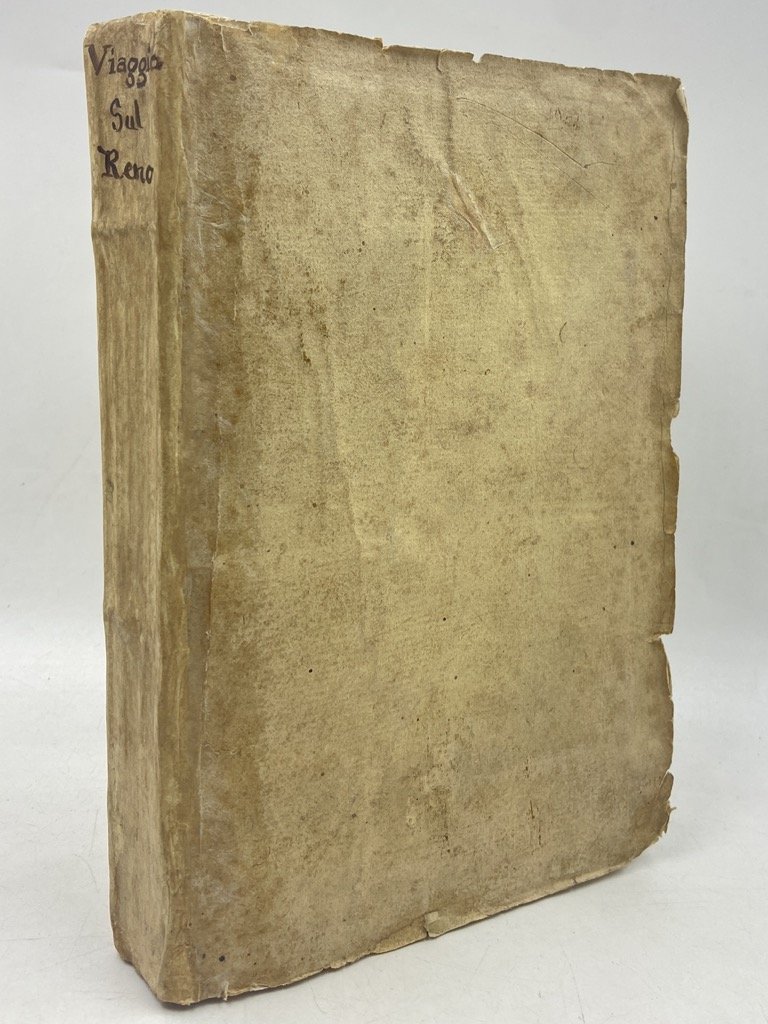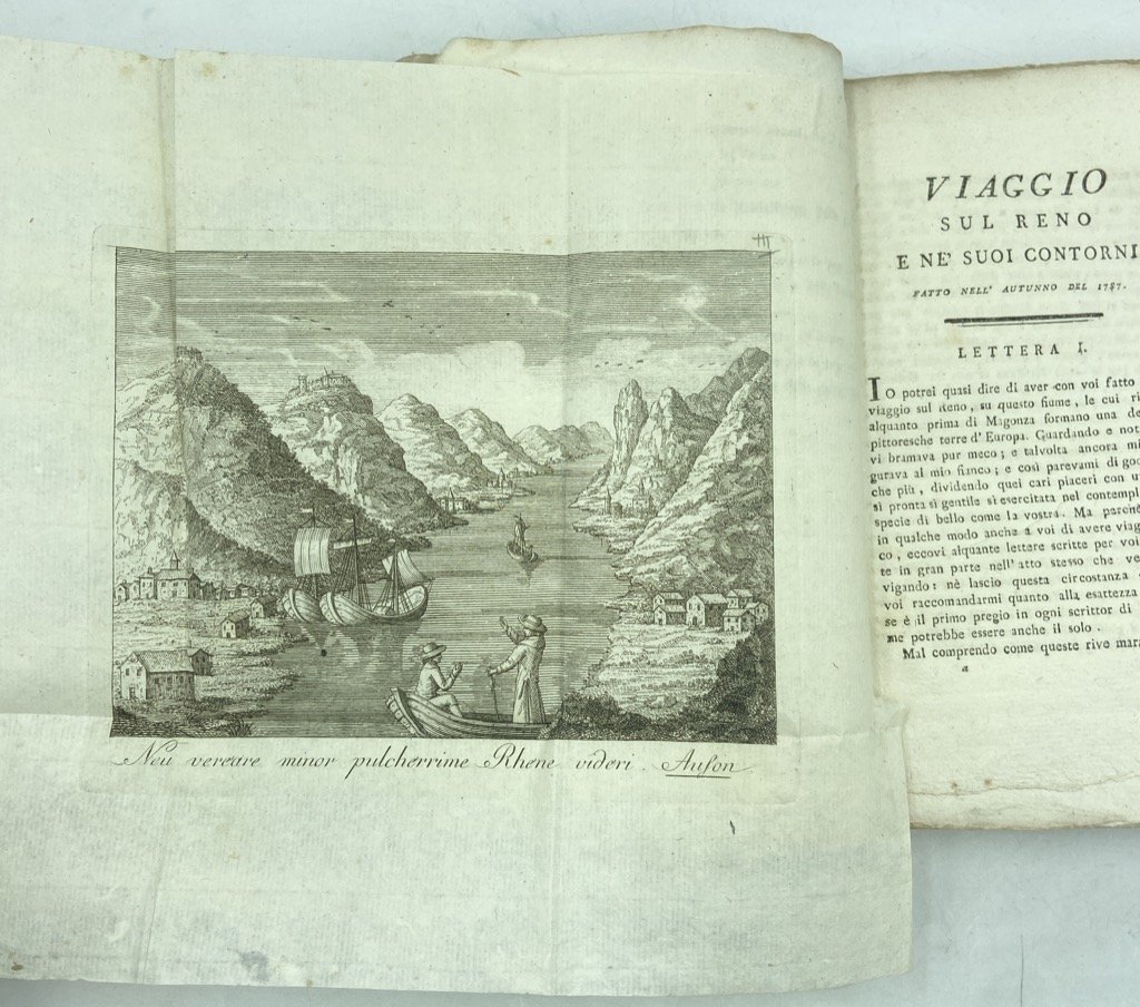 Brossura muta d'attesa con titolo manoscritto sul dorso, 8vo cm 19 x 13, pp (8) 181 (1); frontespizio calcografico, carta del corso del Reno da Magonza a Düsseldorff più volte ripiegata all'antiporta, 7 vedute ripiegate incise in rame. Segnatura: π4 a-k8 l12. Legatura in brossura d'attesa, ma bell'esemplare, genuino e in barbe. Edizione originale di questo “Quadro da vivezza di colori animato e variato” (Gamba, 2543). Aurelio Bertola, intellettuale salottiero e girovago, docente a Napoli e Pavia, irrequieto tramite fra letteratura arcadica e suggestioni preromantiche, trova in “quei paesaggi stranieri, idillici e insieme esotici (.) una occasione particolarmente idonea a svegliare la sua tenue ma genuina poesia della "sensibilità" deliziosamente oscillante fra i diletti della contemplazione della natura pittoresca e quelli della meditazione teneramente malinconica" (Bigi, DBI). L'opera è scritta in forma epistolare ed è dedicata alla marchesa cesenate Orintia Romagnoli Sacrati, che col Bertola condivise il gusto letterario (membro dell'Accademia d'Arcadia dal 1782) e le simpatie repubblicane.