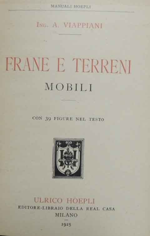 Antonio Viappiani, Frane e terreni mobili, Ulrico Hoepli Editore-Libraio della Real Casa, Milano 1925, pp. XII, 184, ill. b.n., cm 15, cart. ed. con titoli al dorso e al piatto, sovraccoperta e tagli spruzzati di rosso. Collana Manuali Hopeli. Tracce d’uso alla sovraccoperta con due piccole mancanze al dorso e un piccolo rinforzo interno, minime fioriture, lievissima brunitura della carta, per il resto copia molto ben conservata.