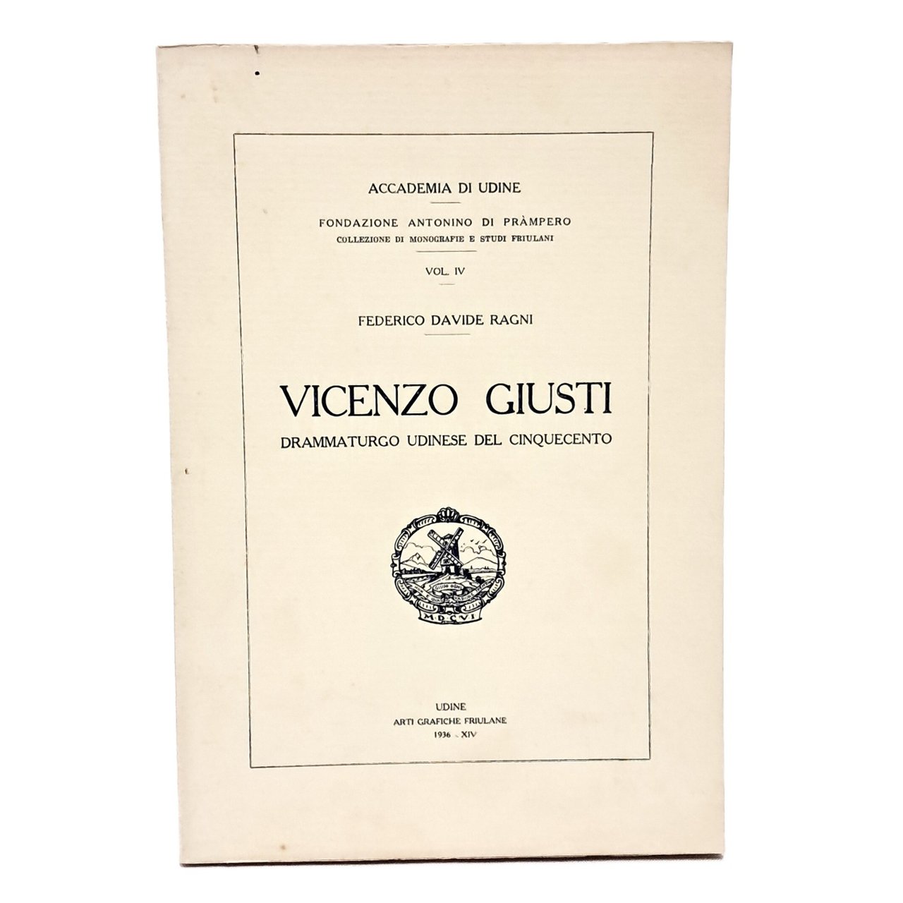 PRIMA EDIZIONE, pubblicazione edita dall'Accademia di Udine collezione di monografie e studi friulani volume IV Biografia di Vincenzo Giusti, drammaturgo nato nel 1532 e morto nel 1619 la cui opera teatrale offre qualche curiosità per la storia della letteratura friulana ed italiana. Il G. si distinse del resto, come autore prolifico e stimato, premiato sia dal favore del pubblico, sia dai positivi giudizi di contemporanei eruditi quali Francesco Sansovino e Giason De Nores. La sua produzione teatrale venne apprezzata anche dalle generazioni successive, com’è testimoniato da alcune note critiche di Giusto Fontanini, Apostolo Zeno e Giovanni Mario Crescimbeni che, nella sua Istoria della poesia italiana, collocò l’Arianna del G. fra le sedici tragedie nazionali più importanti del secolo XVI. Il primo lavoro teatrale dato alle stampe fu la tragedia Irene (Venezia, 1579), ispirata al massacro della popolazione cristiana nella città di Famagosta, avvenuto durante la conquista di Cipro da parte dei Turchi. A questa seguì l’edizione di una seconda tragedia, Almeone (Venezia, 1588), che narra la triste vicenda dell’eponimo personaggio, che uccise la propria madre, ritenendola colpevole della morte del padre, caduto nel corso della guerra contro Tebe. Diciotto anni dopo la prima messa in scena, venne stampata la sua terza tragedia, Hermete (Venezia, 1608), ambientata a Cidone, città dell’isola di Creta, e incentrata sulla lotta per il potere avviata dal perfido Nicandro ai danni del giovane nipote e legittimo erede al trono Hermete. L’ultima tragedia del Giusti fu l’Arianna (Udine, 1610), dove viene rappresentata la triste morte della principessa cretese, abbandonata da Teseo sull’isola di Nasso. Minore impegno venne profuso dal G. nella produzione di opere che esulassero dal genere tragico. A questo proposito, infatti, si possono citare solo la commedia Fortunio (Venezia, 1593), in cui si narrano le avventure di Elena, che, travestita da uomo e usando lo pseudonimo di Fortunio, partì verso Genova alla ricerca del marito Gisippo, e la favola pastorale Elpina (Udine, 1595), ambientata sui colli friulani compresi tra Buttrio e Gramogliano. A cura di V. Joppi fu pubblicato postumo il Trattato della peste d’Udene dell’anno 1556, in cui il G. descrive i terribili effetti dell’epidemia, ricordata come peste del Memini. Scritti inediti sono il Dialogo delle belle donne di Venzone, il De gli errori di Ulisse, traduzione in ottava rima del canto V dell’Odissea, e una cronaca della nobiltà udinese, continuata dopo la sua morte dal nipote Vincenzo. Due altre opere teatrali del G., la tragedia Alessio e la commedia Miscuglio, sono andate perdute e sono giunte fino a noi come semplici titoli tramandati da alcune fonti letterarie coeve. In brossura. Illustrazioni fuori testo. Pp. 136. Buone condizioni.