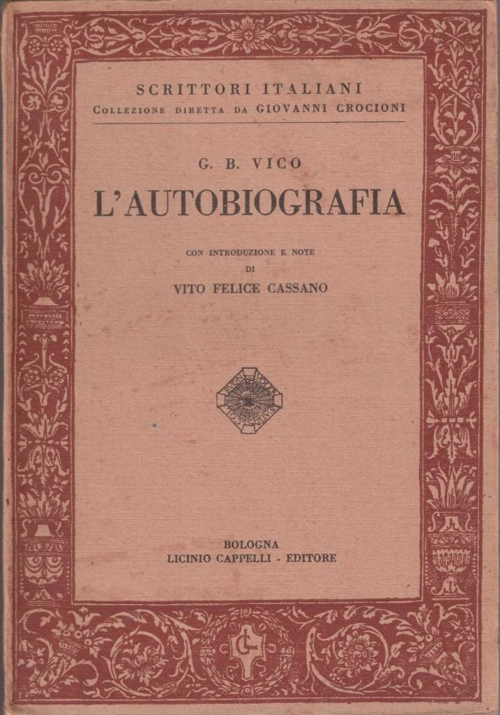 G. B. Vico, L’autobiografia, con introduzione e note di Vito Felice Cassano, Licinio Cappelli Editore, Bologna 1941, pp. XXI, 100, cm 20, br. ed. Collana Scrittori italiani. Sigla d’appartenenza alla prima carta bianca. Lievi tracce d’uso, minime fioriture, leggera brunitura della carta, per il resto ben conservato.