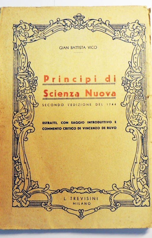Gian Battista Vico, Principi di Scienza Nuova secondo l’edizione del 1744, estratti con saggio introduttivo e commento critico di Vincenzo De Ruvo, Casa Editrice L. Trevisini, Milano s. d. (1940?), pp. 130, cm 21, br ed. Tracce d’uso alla brossura, con strappetti senza mancanze al dorso e ai margini della copertina, e una piccola mancanza alla copertina posteriore, tracce di lapis e pastello colorato al frontespizio, ma nel complesso esemplare in stato di conservazione ancora buono.