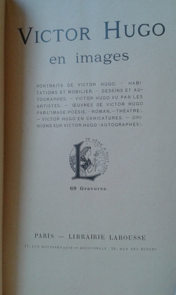 Volume in 8, legatura protettiva in cartoncino, conservata la brossura originale figurata con ritratto fotografico dell'autore, sguardia (piccolo ex-libris applicato), occhiello, frontespizio, 94 pp., ricchissime di illustrazioni fotografiche, disegni ed incisioni. Magnifico repertorio iconografico sul grande Hugo, insieme alle notizie biografiche e bibliografiche arricchite da molte curiosit inedite, e ad alcuni passi salienti della sua letteratura, qui riunita tutta l'iconografia che lo riguarda: i ritratti nelle varie epoche, le caricature, le immagini delle abitazioni e dell'arredamento, i suoi disegni e i documenti autografi, immagini riguardanti la sua opera poetica, romanzata e teatrale. Completano l'opera le opinoni sullo scrittore, di alcuni importanti personaggi dell'epoca. Raro, piacevole ed in bello stato.
