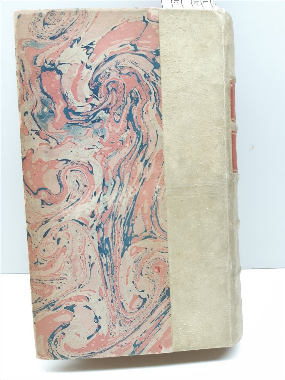 legatura rigida in mezza pelle con piatti marmorizzati dorso a 5 nervi con etichetta e titoli in oro in discreto stato alcune sporcizie e aloni ai piatti, tagli superiori impolverati colorati di rosso, interno in buono stato in francese numero pagine 322 dimensioni cm 16,2 x 10,2