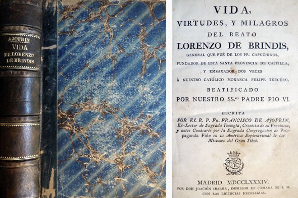 Madrid, por Don Joachin Ibarra, Impresor, 1784. 4to.; portada, XIV - 632 pp. Ejemplar falto de la última página de texto, correspondiente a las fiestas celebradas en Italia por la beatificación. Encuadernación en media piel. La obra aparece dedicada a los Duques de Alba, Don José Alvarez de Toledo y Doña Teresa Silva, por el autor, su capellán. Contiene numerosos datos sobre la actuación diplomática al servicio de Felipe III de Lorenzo de Brindis (1559-1619) cerca de Don Pedro de Toledo, Gobernador de Milán, así como sobre las primeras fundaciones capuchinas en España. Son destacables tambien dos capítulos sobre Villafranca del Bierzo, lugar de sepultura del Beato.