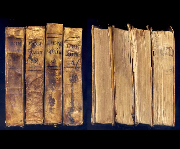 Barcelona, por Juan Jolis, s.a. (1755). Cuatro volúmenes en 8vo.; 14 hojas, 363 pp., 2 hojas + 1 hoja, 402 pp., 1 h. + 8 hojas, 380 pp., 2 hojas + 2 hojas, 447 pp., 2 hojas. Ejemplar con perdida de un pequeño trozo de papel al pie de la portada en el Tomo I; falto de portada, pp.27 y letras en la hoja de Licencia y primeras 25 pp. en el tomo II. Tomo III: agujero que afecta a cinco lineas en la pp. 13/14, pérdida de un tercio del texto en la pp. 15/16. Tomo IV: sin incidencias. Con 40 bloques xilográficos entre el texto. Impresión sobre papel muy fragil. Encuadernación uniforme de época en pergamino, ligeramente fatigada. Tapas sueltas del cuerpo en los cuatro tomos.