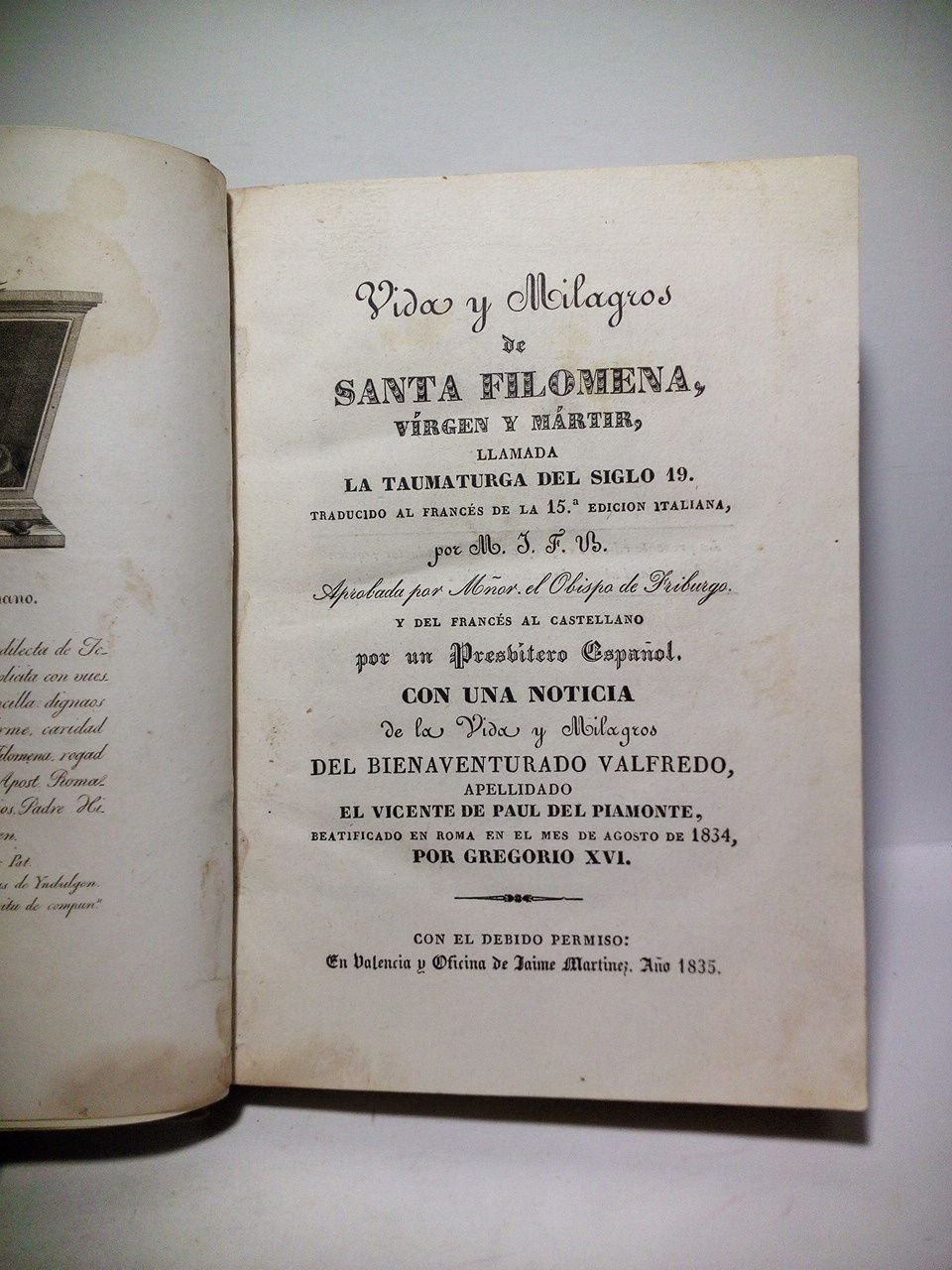 Vida y Milagros de Santa Filomena, virgen y martir, llamada la taumaturga del siglo 19 / Traducido al francés de la 15ª. edición italiana, por M. J. F. B. Aprobada por Monseñor el Obispo de Friburgo. Y del francés al castellano por un Prebítero Español. Con una noticia de la Vida y Milagros del Bienaventurado Valfredo, apellidado El Vicente de Paul del Piamonte, beatificado en Roma en el mes de Agosto de 1834. por Gregorio XVI