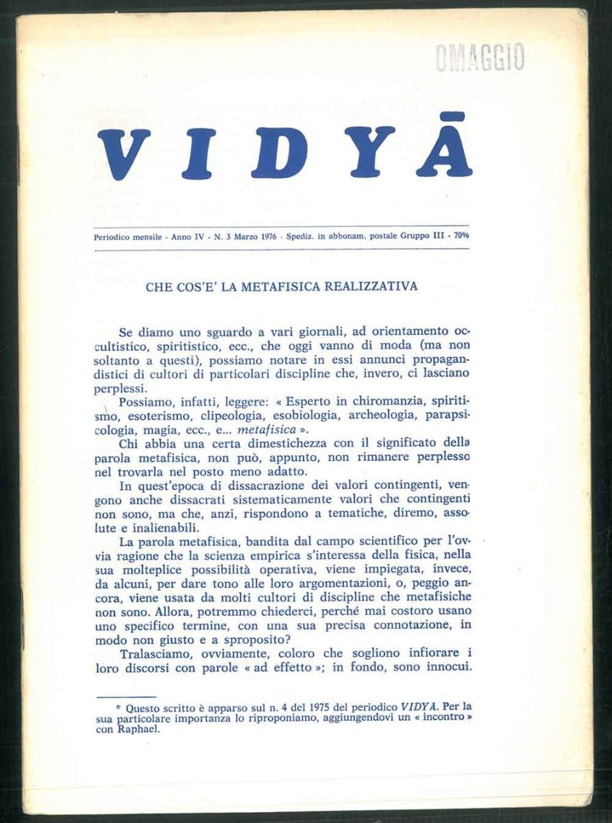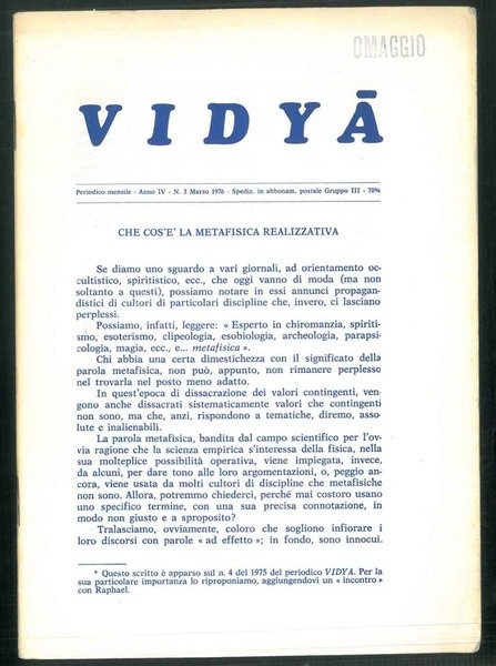Vidya. Periodico mensile - Anno IV - 3 Marzo 1976. Che cos'è la metafisica realizzativa.