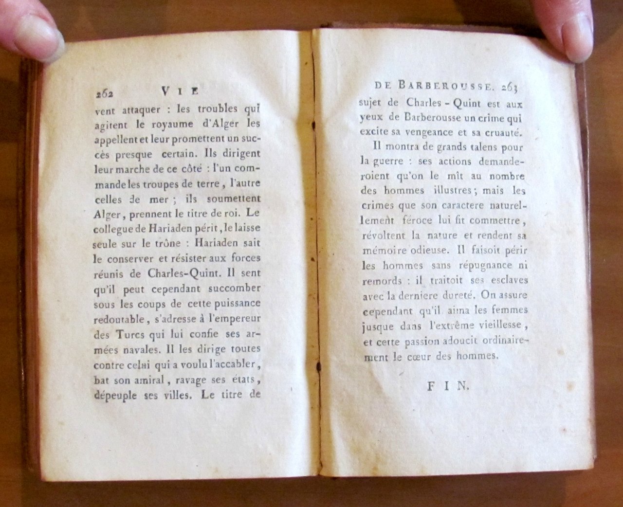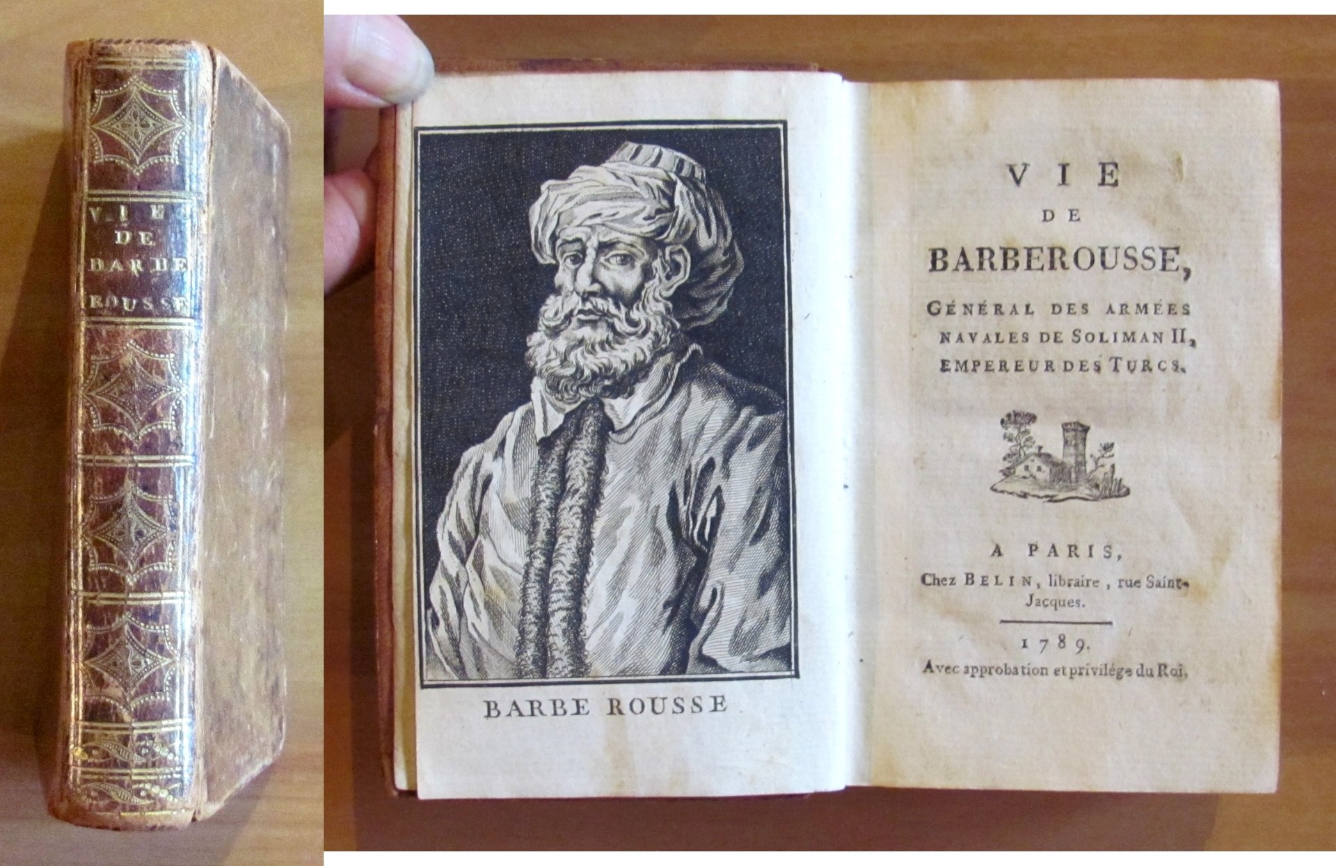 Bel ritratto di Barbarossa inciso in antiporta f.t. Ed. Chez Belin - Paris, 1789 - Avec approbation et Privilége du Roi. Pelle editoriale con titoli e fregi in oro al dorso. Lievissima usura del tempo alla sola cerniera anteriore. Interno freschissimo. 8,5x13; pp.263. Raro e in Ottimo stato. , Molto buono (Very Good)