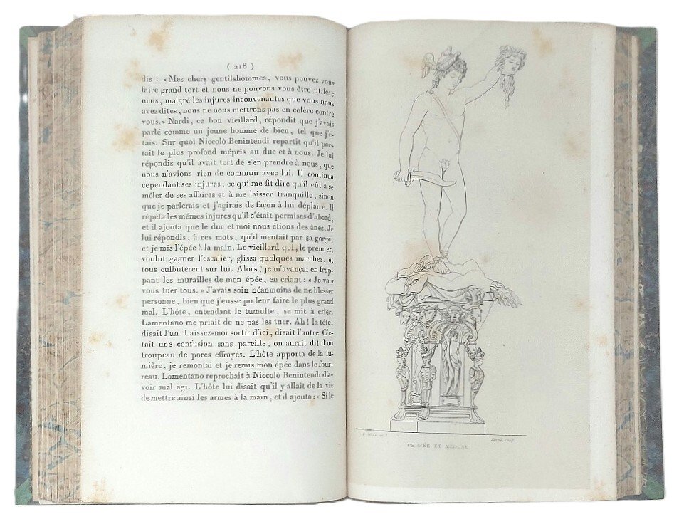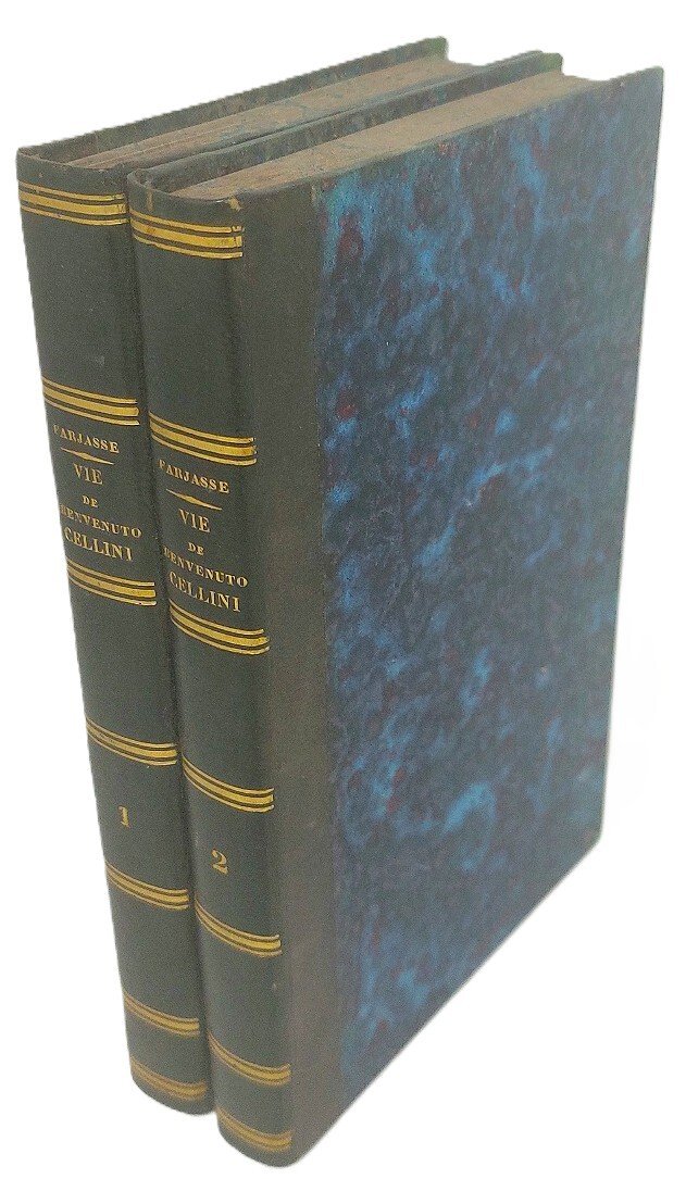 >2 volumi in-8, pp. (4), XXV, (3), 361, (7); (4), 411, (1), legature coeve in mezza pelle verde, titoli in oro ai dorsi, tagli marmorizzati. Con un ritratto del Cellini in antiporta e 2 tavole f.t. Prima edizione in francese, traduzione di Denis-Dominique Farjasse. Antiche note di possesso ms. al titolo, usuali fioriture della carta.