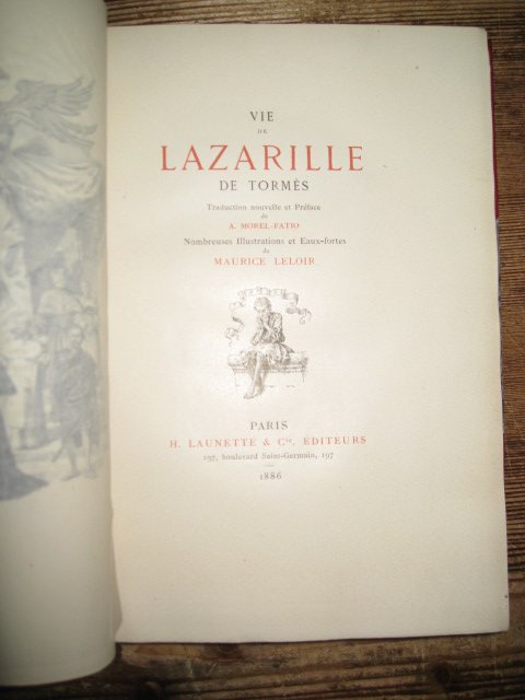 In-8° (234x158mm), pp. (8), XXII, (2), 146, (6), bella legatura in m. marocchino rosso e angoli con titolo in oro su dorso a 4 nervi. Taglio di testa dorato, sguardie marmorizzate. Conservate all'interno le brossure editoriali figurate incamiciate. Frontespizio in rosso e nero con vignetta centrale. Disegni n.t. e acqueforti f.t. (una all'antiporta) di Maurice Leloir. Eleganti fregi tipografici n.t. Perfetto esemplare entro custodia in cartone marmorizzato con bordi in marocchino. 'Édition de grand luxe', in esemplare privo di numerazione (ne furono stampati un esemplare unico 'sur papier du Japon' e 105 esemplari ripartiti in tre distinte tirature). Traduzione francese del Morel-Fatio con le illustrazioni di Leloir di questo grande classico della letteratura picaresca. Palau, 133494: 'Bella edición y la preferida entre las modernas.'. Carteret, Trésor du Bibliophile, IV, p. 210 [con ascrizione dell'opera, la cui paternità è incerta, all'Hurtado de Mendoza]: 'Belle publication cotée'.