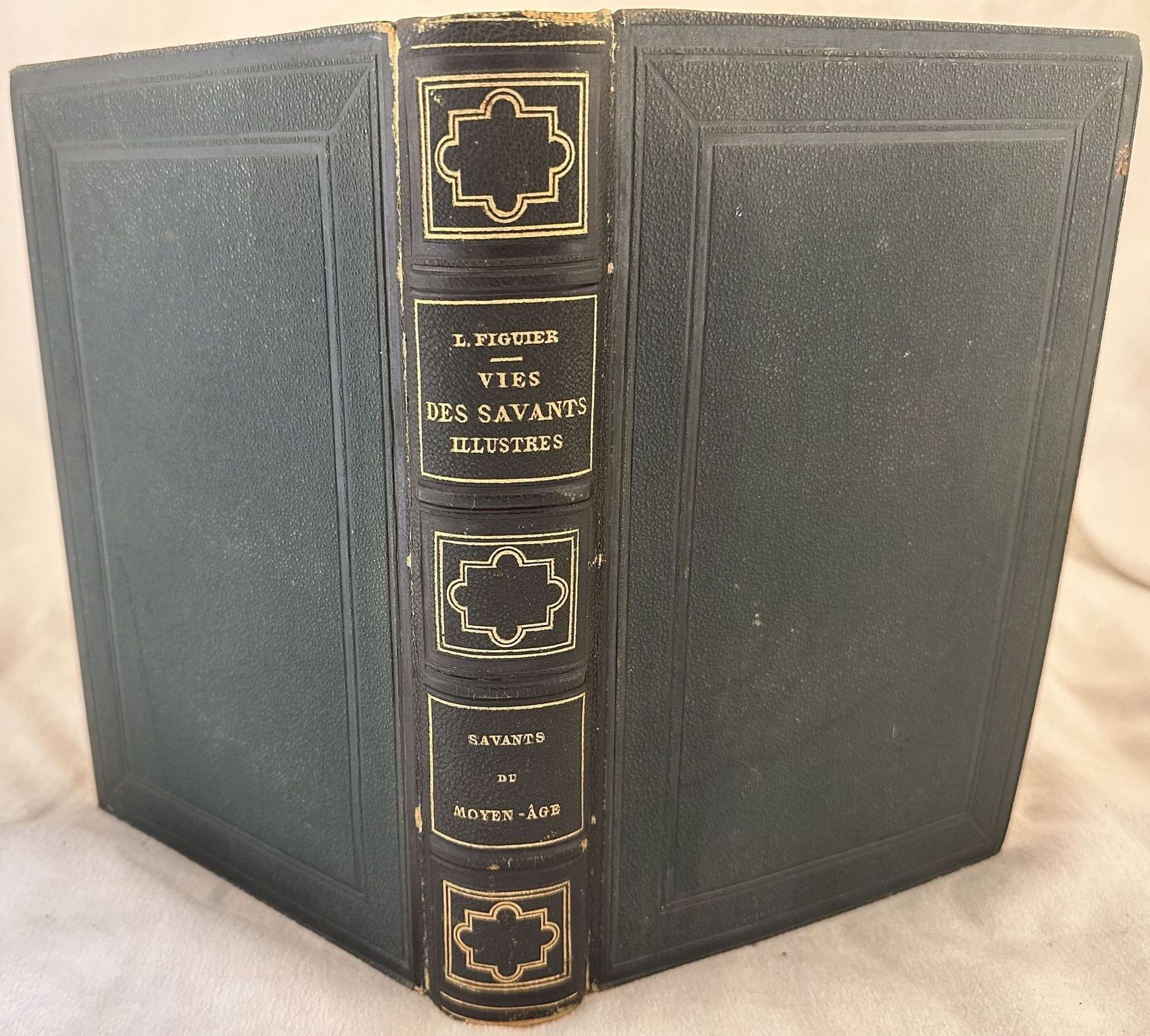Bella edizione francese del 1867 di questa opera di storia medievale dello scrittore e divulgatore scientifico francese Louis Figuier (1819-1894). L'opera riporta alcune biografie di uomini illustri del periodo medievale. All'interno: Geber, Mesue il vecchio, Abu Bakr Al Razi, Avicenna, Averroè, Abu al-Qasim, Tabella sello sttao delle scienze in Eruopa durante il medioevo, Alberto il Grande, Tommaso d'Acquino, Roger bacon, Vincenzo di Beauvais, Arnauld de Villeneuve, Raymond Lulle, Guy de Chauliac, Jean Gutenberg, Fust e Schoeffer, Cristoforo Colombo, Amerigo Vespucci ecc. Ex libris al contropiatto anteriore. All'interno sono presenti 37 tavole fuori testo di ritratti di uomini illustri. Tagli dorati. In buone condizioni. Copertina in mezza pelle con titolo e decorazioni in oro al dorso in buone condizioni generali con lievi usure ai margini e dorso. Legatura in buone condizioni. All'interno le pagine si presentano in buone condizioni con fioriture. In 8. cm 24x16,5. Pp. (4)+III+496+37 pl.Beautiful french edition of 1867 of this work of medieval history by the french writer and scientiphycal and scientiphycal divulgator Louis Figuier (1819-1894). The work describes a series of biographies of important medieval people. Inside: Geber, Mesue il vecchio, Abu Bakr Al Razi, Avicenna, Averroè, Abu al-Qasim, Tabella sello sttao delle scienze in Eruopa durante il medioevo, Alberto il Grande, Tommaso d'Acquino, Roger bacon, Vincenzo di Beauvais, Arnauld de Villeneuve, Raymond Lulle, Guy de Chauliac, Jean Gutenberg, Fust e Schoeffer, Cristoforo Colombo, Amerigo Vespucci ecc. Inside there are 37 out of text plates. Exd libris in the front counterplate. In good conditions and complete. Half leather cover with gilted title and decorations in the spine in good general conditions lightly worn in the extremities. Binding in good conditions. Inside pages are in good conditions with foxings. In 8. cm 24x16,5. Pp. (4)+III+496+37 pl.