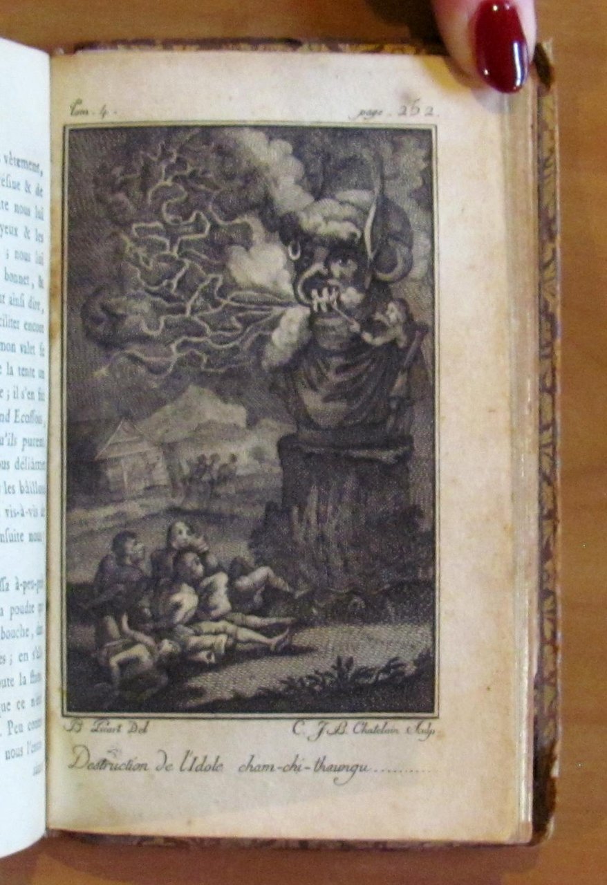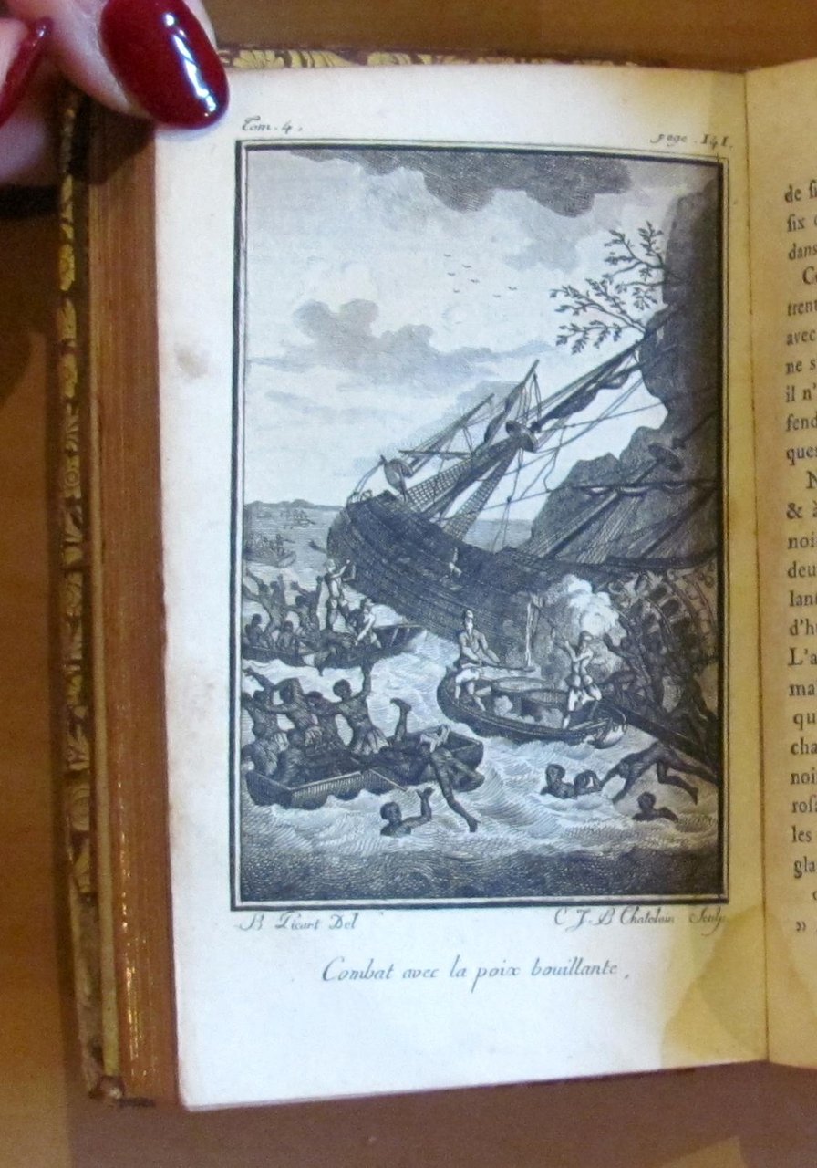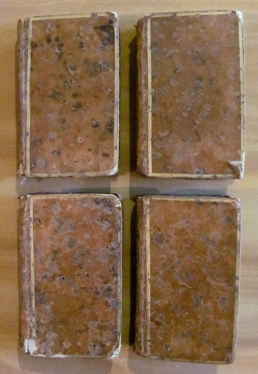Opera completa in 4 Volumi. Incisioni in b/n f.t. e 1 Mappa del Mondo, più volte ripiegata, f.t. Edition de Cazin, 1784. Legature editoriali in pelle con cornici in oro ai piatti e titoli e fregi in oro ai dorsi. Le fioriture e ossidazioni del tempo hanno maculato le copertine e quasi del tutto scolorito i dorsi. Alcune piccole spellature della pelle particolarmente ai margini bassi delle copertine e delle cuffie inferiori. Tagli dorati alle pagine e interni incredibilmente freschissimi e puliti. Annotazione del tempo in antiporta al primo volume. 8x13; pp.313+320+298+316. Molto Rari e in Buonissimo stato. , Molto buono (Very Good)