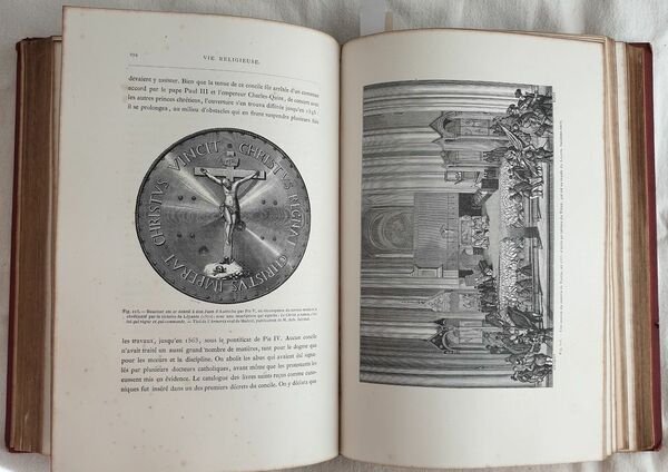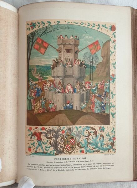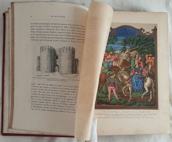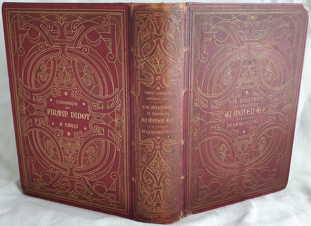 Bella edizione del 1873 di questa opera sulla vita militare e religiosa nel medioevo e Rinascimento scritta da Paul Lacroix. Numerose illustrazioni in bianco e nero e 14 finissime planches in cromolitografia coperte da velina. Testo in lingua francese. All'interno: Feudalità, guerree e armi, Marina, Crociate, Cavalleria e duelli, ordini militari, Liturgia e cerimonie, I Papi, Clero secolare, Ordini religiosi, Istituzioni caritatevoli, Pellegrinaggi, Eresie, Inquisizioni, Funerali e sepolture ecc. In buone condizioni. Copertina in pelle editoriale con titolo e decorazioni in oro in buone condizioni generali con lievi usure ai margini e dorso. Legatura in buone condizioni. Le prime cinque pagine in parte staccate. Pagine in buone condizioni con fioriture. In 4. Dim. 29x21 cm. Pp. V+57. Peso Kg. 2,170. Beautiful edition of 1873 of this work about military and religious life during Middle age and Rinascimento written by Paul Lacroix. Different black and white illustrations and 14 fine planches in chromolythography covered by tissue paper.<BR> Text in french language. In good conditions Editorial leather cover with golden title and decorations in the spine in good general conditions slightly worn in the edges and spine. Binding in good conditions. Pages are in good conditions with foxings. The first five pages partially detached. Pages in good conditions with foxings. In 4. Dim. 29x21 cm. Pp. V+571