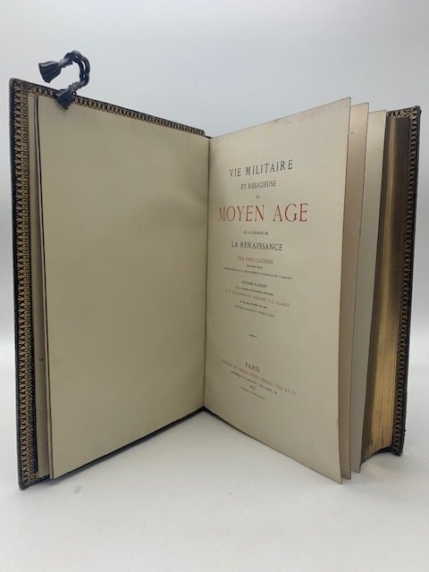 In 4, cm. 20 x 29,5, pp. V + 571 + (3), con 196 cromolitografie di F. Kellerhoven, Regamey e L. Allard accompagnate da un sottile foglio di carta riportante le spiegazioni e 409 xilografie realizzate da Grave'es Huyot Padre e figli. Elegante legatura in pelle marrone con doppio filetto e fregi in ora ai piatti, dorso con 5 nervi riccamente decorati in oro, tagli dorati. Guardie e controguardie decorate. Ex libris al contropiatto. Uno dei volumi che fa parte dell'opera piu' importante di Lacroix che consiste in una serie di libri di curiosita' storiche iniziata con "Il medioevo" e "il Rinascimento", e terminata con Direttorio, Consolato e Impero: usi e costumi. Testo in francese.