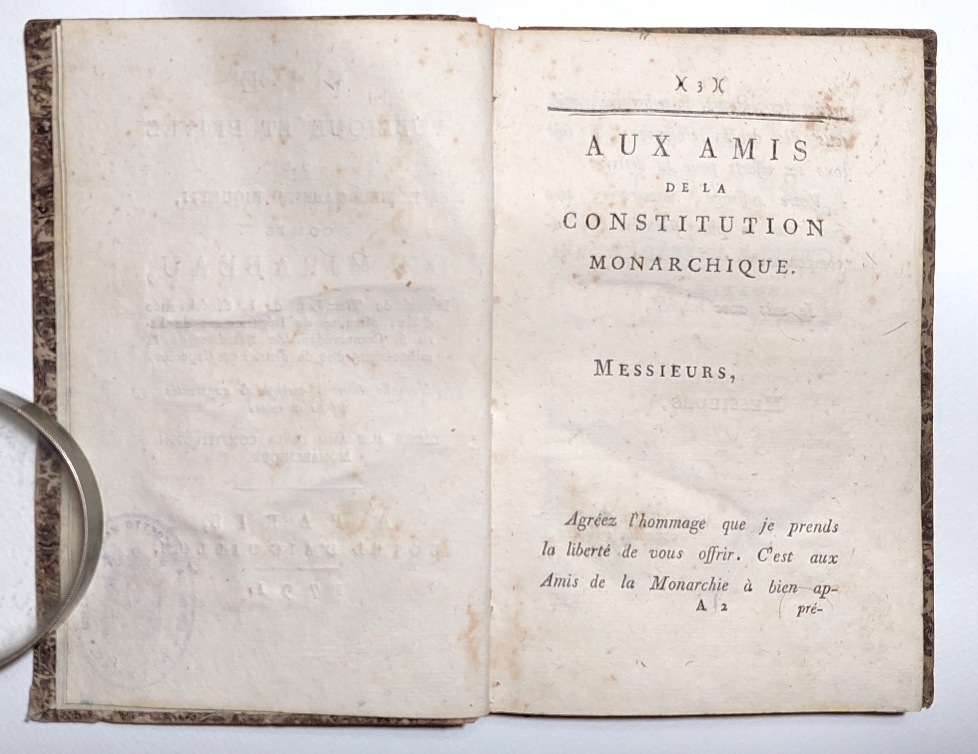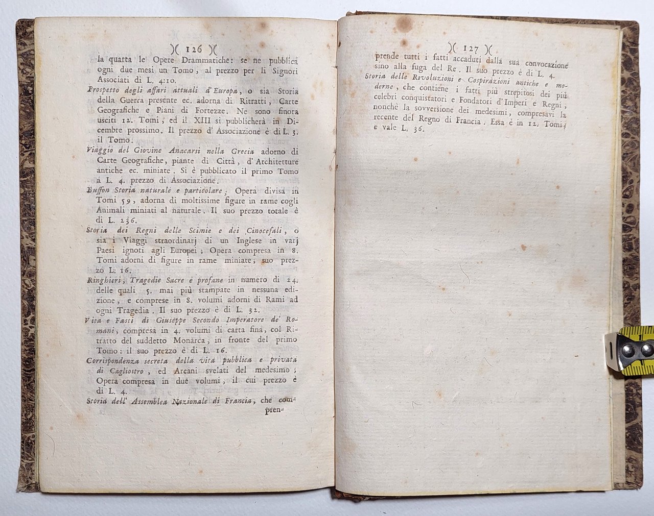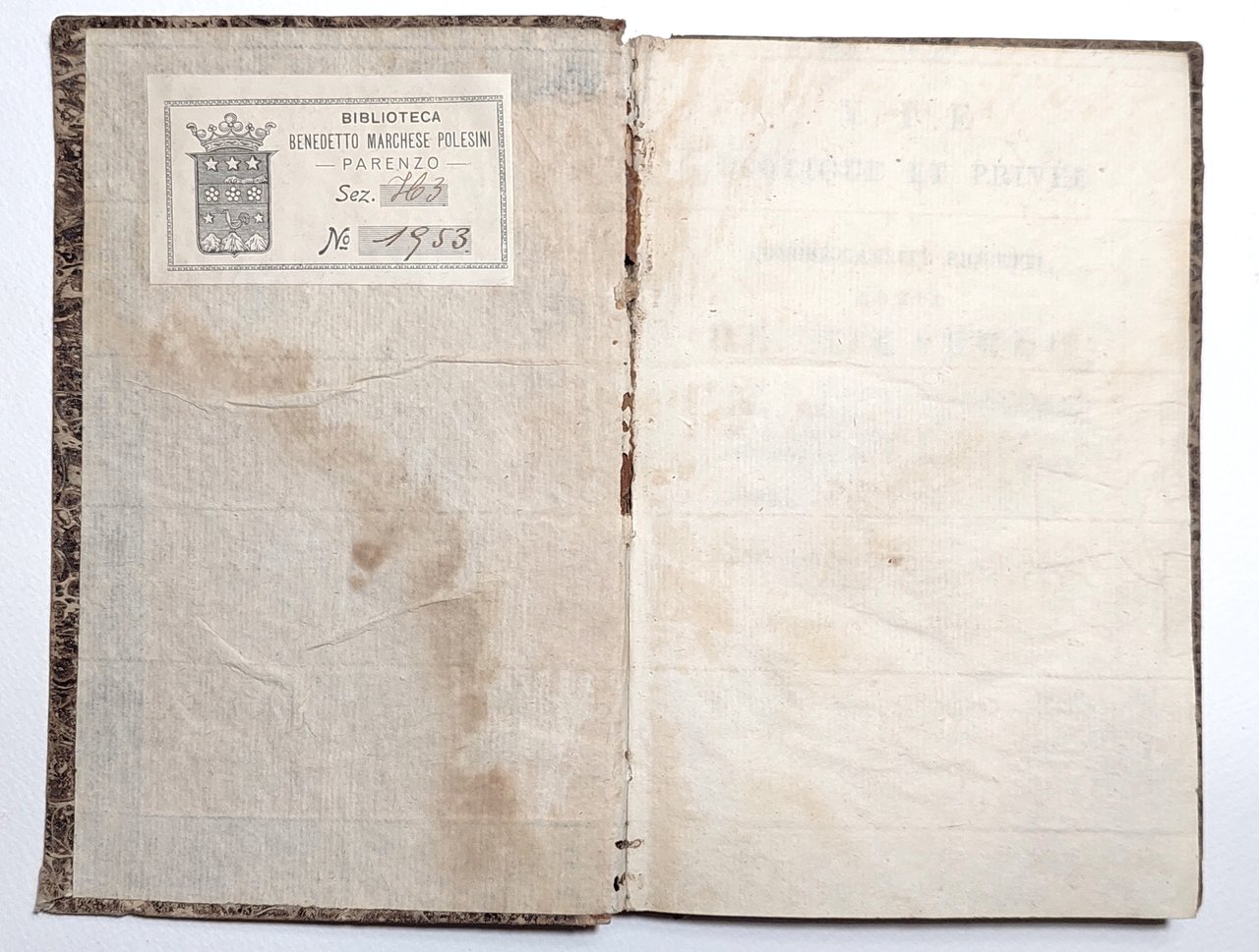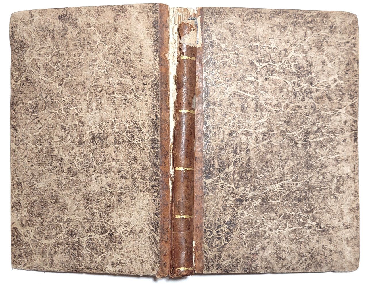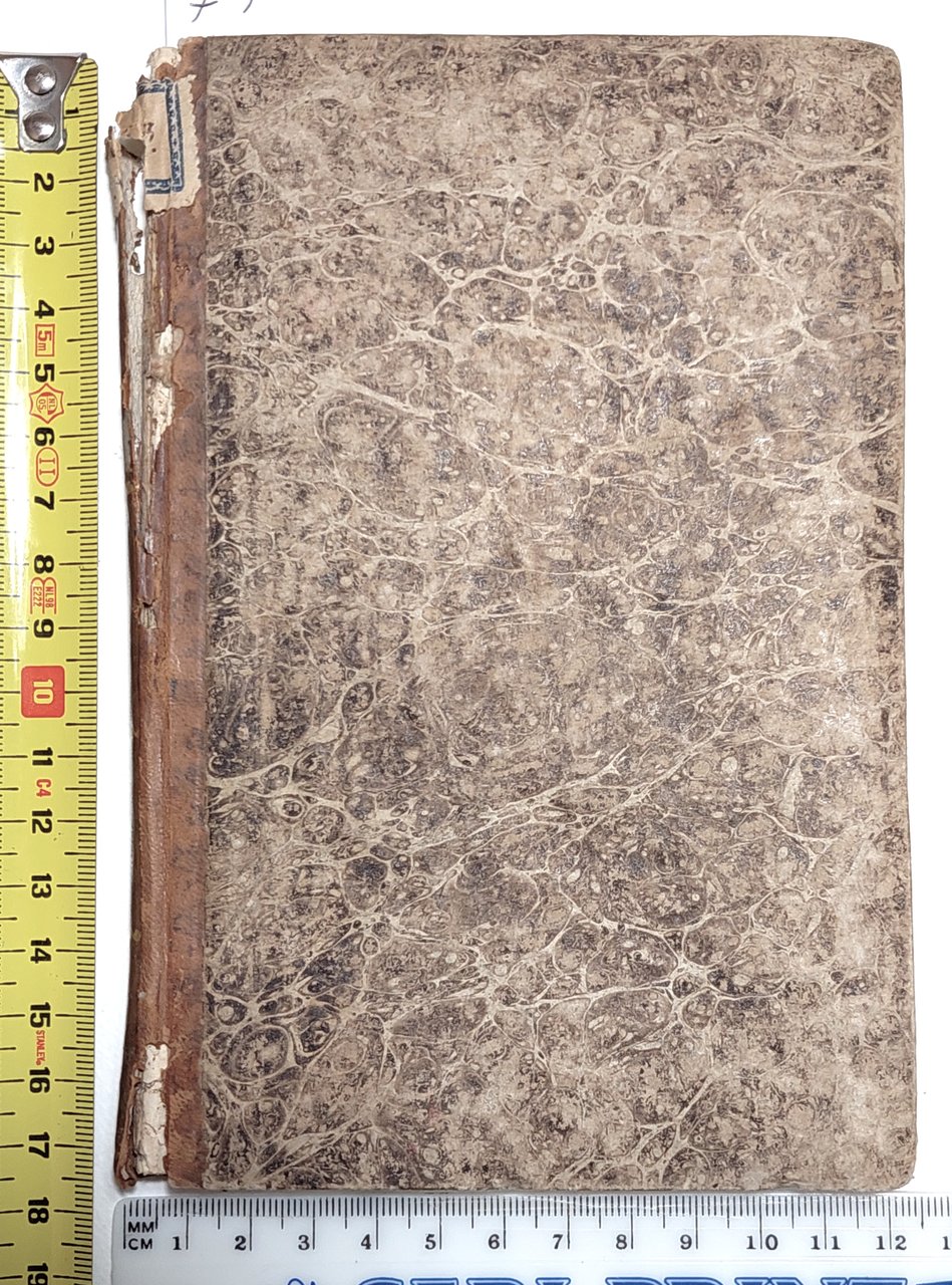 Legatura rigida in mezza pelle in precarie condizioni, dorso quasi staccato dal libro, piatti cartonati marmorizzati in discreto stato, alcune scoloritore e sporcizie ai margini, dorso quasi staccato dal libro con mancanza, tagli spruzzati, alla seconda di copertina Provenienza: Biblioteca Benedetto Marchese Polesini-Parenzo (al verso della copertina, etichetta araldica della con la sua collocazione - timbro ovale araldico - ex-libris della Biblioteca, interno in condizioni accettabili, in francese, fioriture alle pagine interne che non vanno disturbare la lettura, numero pagine 127 dimensioni cm 18 x 12,3