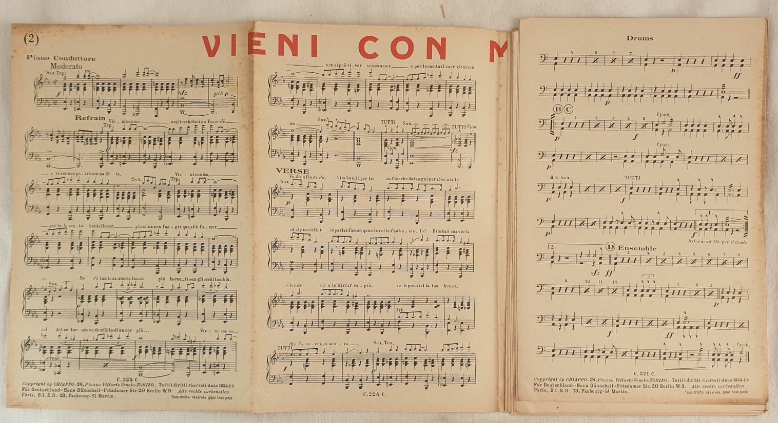 Partitura per orchestra del 1934 delle melodie "Vieni con me" e "Pardon." di Pablito Valabrega Chiappo, Guerrieri Chiappo. Arrangiamento di Gino Filippini. Copertina assente. GENERE: STRUMENTI: pianoforte, violini, sassofono, basso, tromba, trombone,batteria ANNO: 1934 DIMENSIONI: In 4. cm 27x18 PAGINE: pp. 46 CONDIZIONI: Buone condizioni. Fioriture. Ex libris.Beautiful score of two songs of 1934, a score for orchestra of the melodies "Vieni con me" and "Pardon." by Pablito Valabrega Chiappo, Guerrieri Chiappo. Cover lacks MUSIC: STRUMENTI: piano, violins, bass, trumpet, trombone, saxophone, drums<BR>YEAR: 1934 SIZE: In 4. cm 27x18 PAGES: pp. 46 CONDITIONS: Good conditions. Foxing. Ex libris