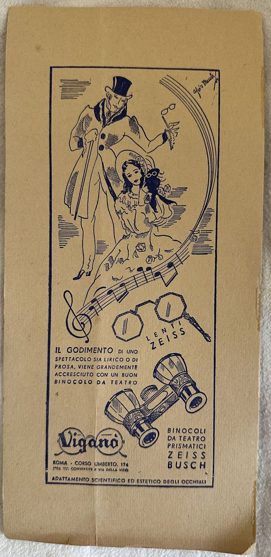 Pubblicità degli anni '30 dei binocoli da teatro prodotti dall'ottica Viganò con lenti Zeiss. Illustrazione firmata Much. In buone condizioni.Piegature. In 16. cm 24x11. Pp. (2)Advertising of 1930's of binoculars produced by ottica Viganò with Zeiss lenses. <BR><BR>Illustration signed Much. In good conditions. Foldings. In 16. cm 24x11. Pp. (2)<BR><BR>