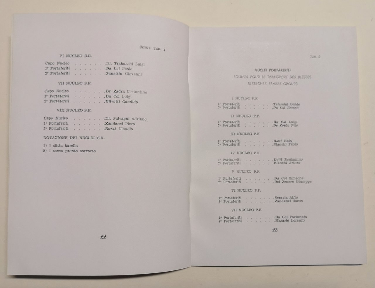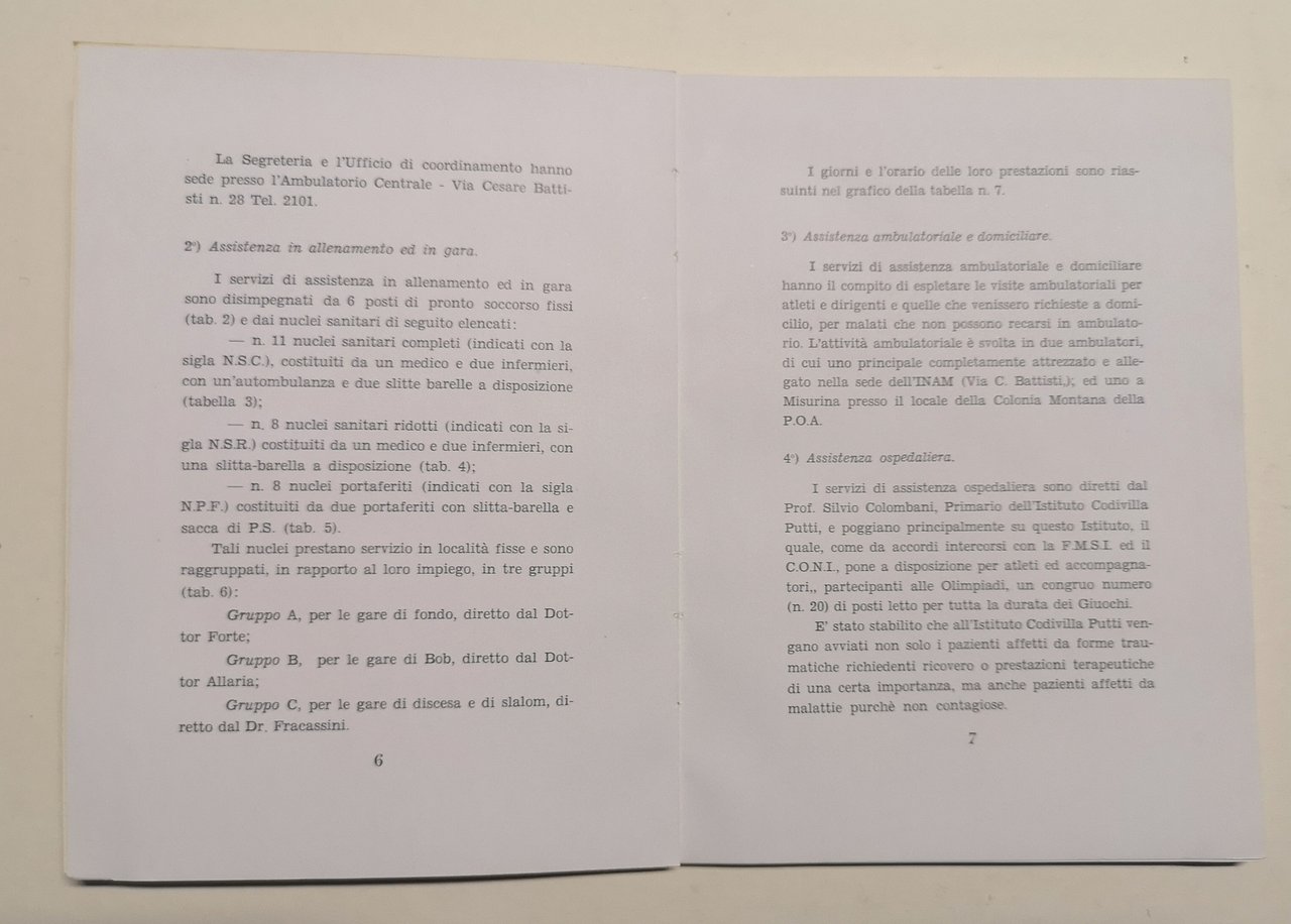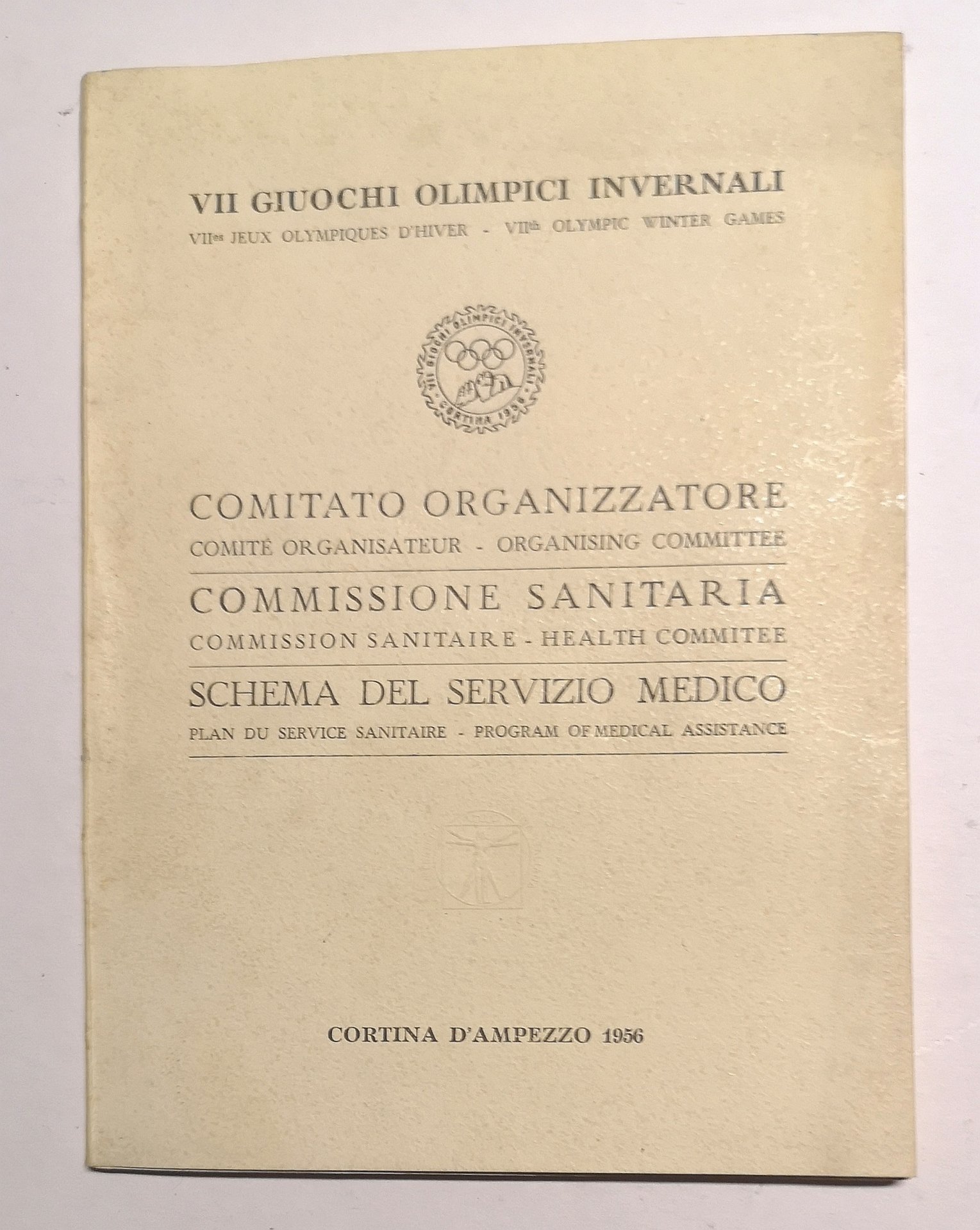 >in-8, pp. 46, 6 tavole a colori di tabelle e grafici dell'impiego dei singoli gruppi sanitari. Broch. edit. Edizione originale, assai rara, della guida all'assistenza sanitaria durante le olimpiadi invernali a Cortina d'Ampezzo. Testo in italiano, francese ed inglese. Dettagliatissimo vademecum che espone non solo le procedure mediche poste in essere, ma anche le liste degli operatori sanitari e le dotazioni mediche a disposizione; tra le tavole figurano anche foto e mappe delle piste con segnalati i presidi sanitari fissi e mobili. Perfetto esemplare.