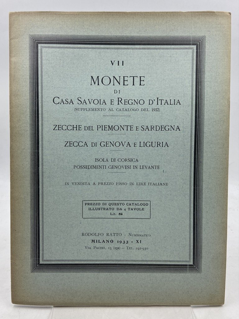 VII. MONETE di CASA SAVOIA E REGNO D’ITALIA (SUPPLEMENTO AL CATALOGO 1932). ZECCHE DEL PIEMONTE E SARDEGNA. ZECCHE DI GENOVA E LIGURIA. ISOLA DI CORSICA. POSSEDIMENTI GENOVESI IN LEVANTE. Milano, Rodolfo Ratto Numismatico 1933.
