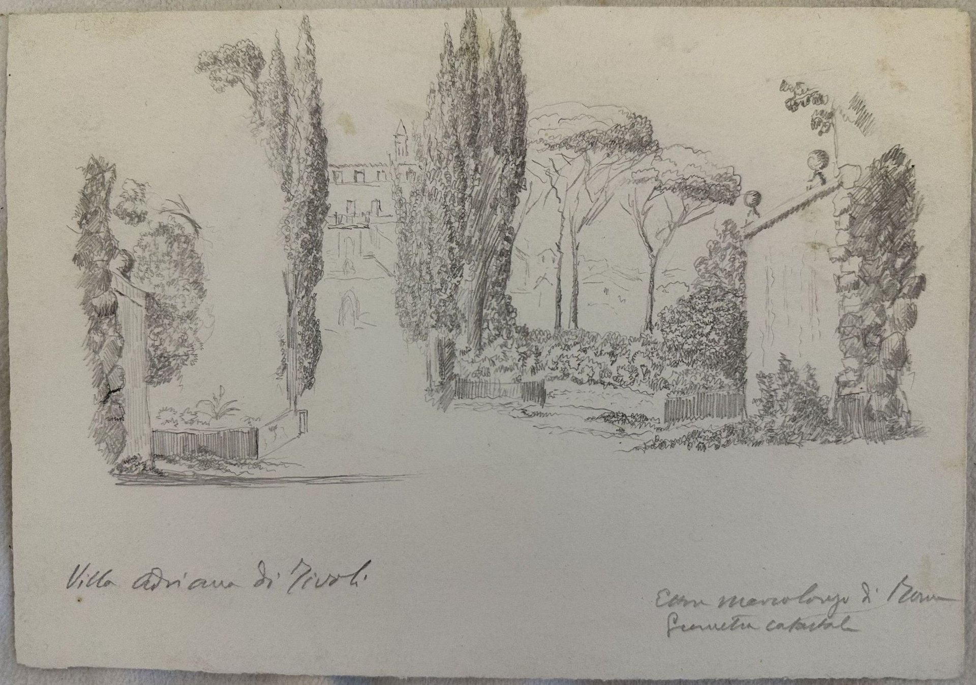 Finissimo disegno a matita su carta che rappresenta Villa d'Este di Tivoli di un geometra catastale. Appunti al verso. Senza data ma della fine dell'ottocento inizi novecento. In ottime condizioni, rare fioriture Dim. cm. 21,5x15.Very fine drawing with pencil on paper representing Villa Adriana in Tivoli by drawer of Catasto. Notes in the verso. Not dated but of late 19th century early 20th century. In very good conditions, occasional foxing. Dim. cm. 21,5x15.
