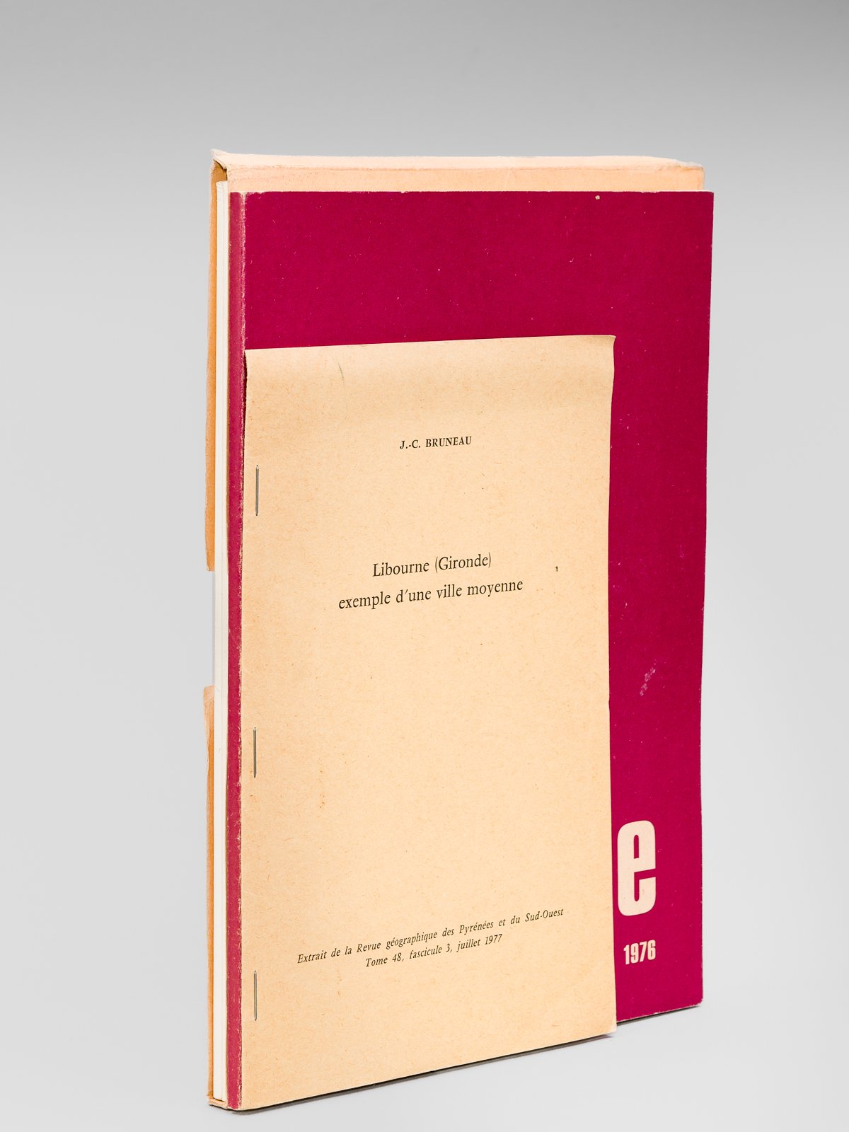 Ensemble de 3 titres à savoir : Ville de Libourne métropole viticole (2 Tomes - Complet) Politique des Villes moyennes Programme 1974, 2 vol. in-4 br. sous étui commun, 137 pp. [ On joint : ] Libourne. Contrat ville moyenne octobre 1976, 69 pp. [ On joint: ] Bruneau : Libourne. Exemple d'une ville moyenne, Extrait de la Revue géographique des Pyrénées et du Sud-Ouest, Tome 48 fasc. 3 juillet 1977, pp. 287-301 Très intéressant ensemble de 3 titres sur le thème de "Libourne ville moyenne". Bon ensemble.