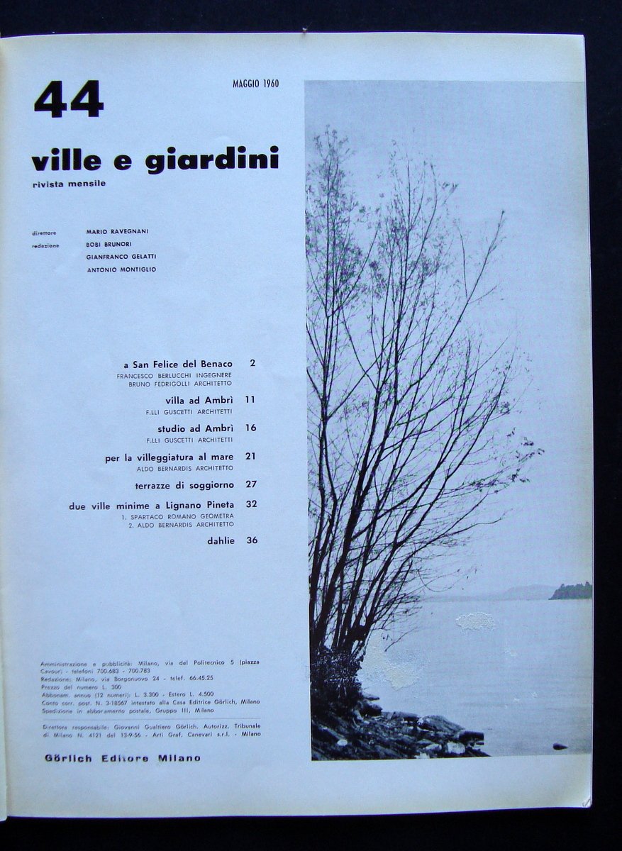 Rivista mensile, VILLE E GIARDINI" Rivista mensile di architettura - arredamento Numero 44 Maggio 1960 Gorlich editore, Milano 1960, cm 29x22, pp. 40 con numerose ill. in maggioranza fotogr. in b/n nel. t. e fuori. t. (qualcuna a col.), varie inserzioni pubblicitarie in b/n e a col. in apertura di testo; brossura ed. ill. a colori. Numero completo. Condizioni di conservazione Esemplare in buone condizioni con tracce d'uso; angolo inf. della br. ant. e di alcune pagine con leggero accenno di pieghetta Numero completo. RVS001N00054 "