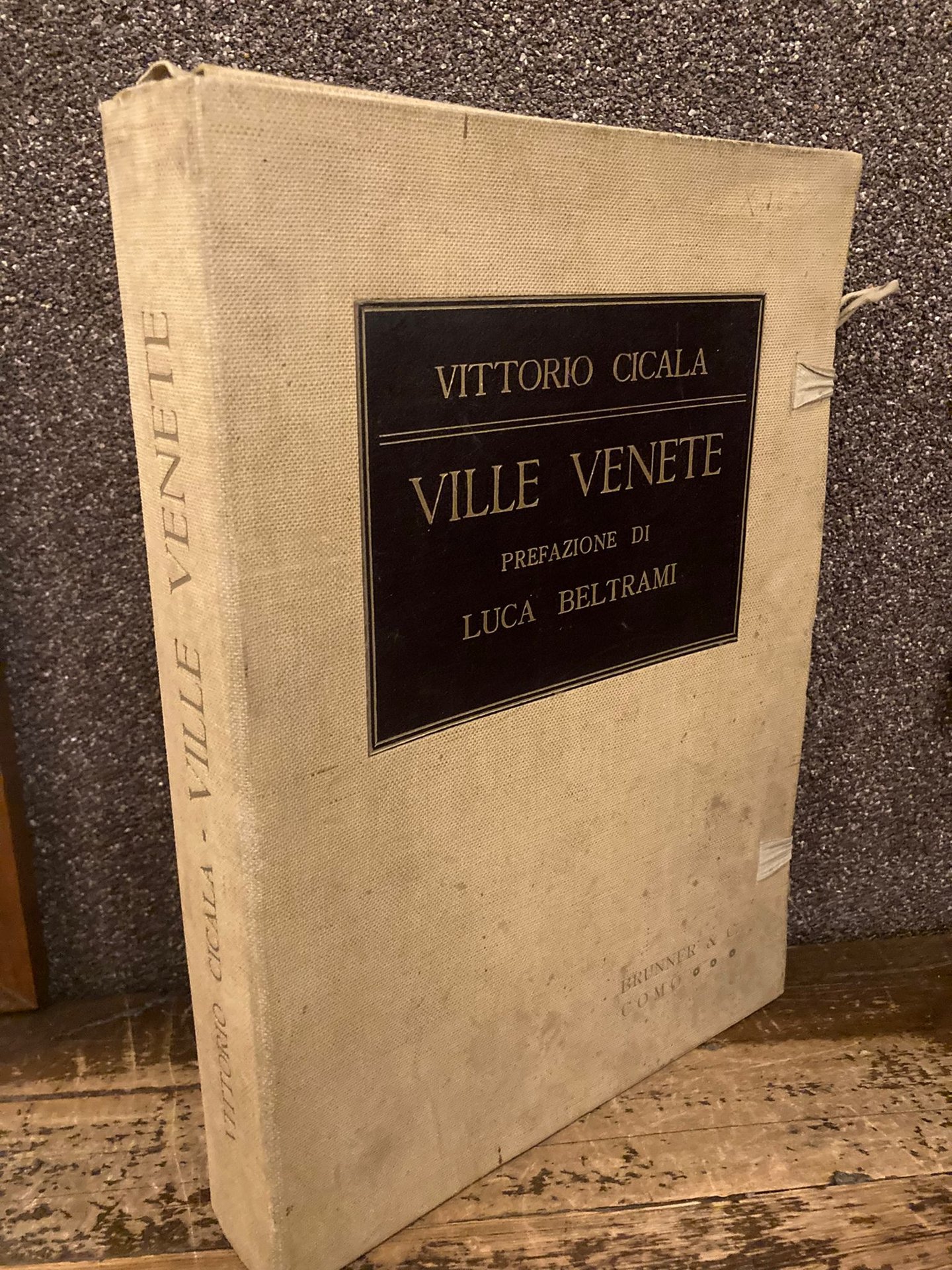 Cartella editoriale in cartonato rigido rivestito di tutta tela grezza con legacci di chiusura, titoli dorati su tassello nero applicato al piatto anteriore, contenente pp. (6) di testo, 112 carte di tavole sciolte (30x22 cm) raffiguranti fotograficamente 41 ville. Ottimo esemplare. Non comune cartella iconografica contenente tavole ottenute con lastre Cappelli. Dedica a stampa del Cicala A Francesco Saverio Nitti. Prefazione di Luca Beltrami.