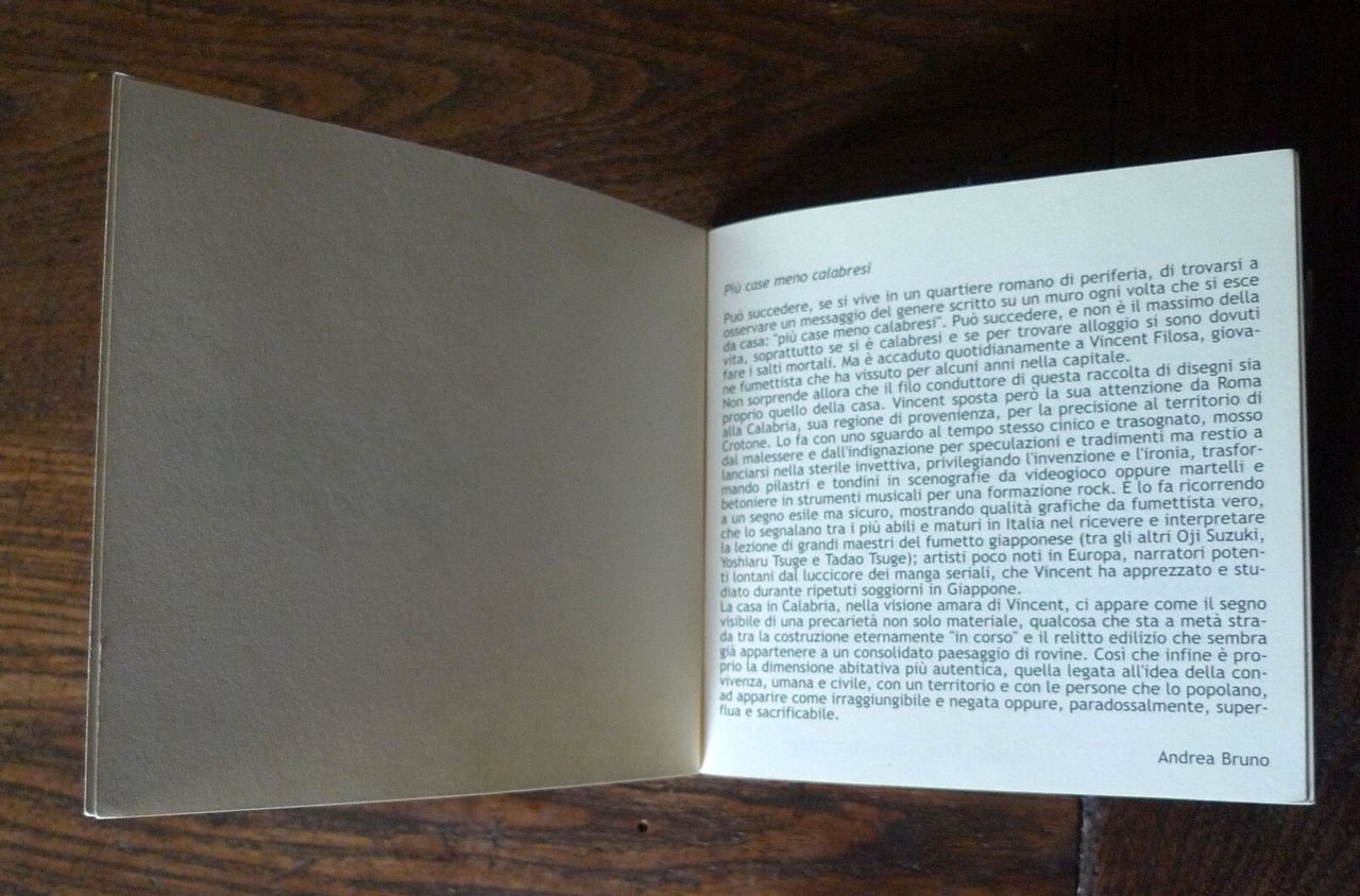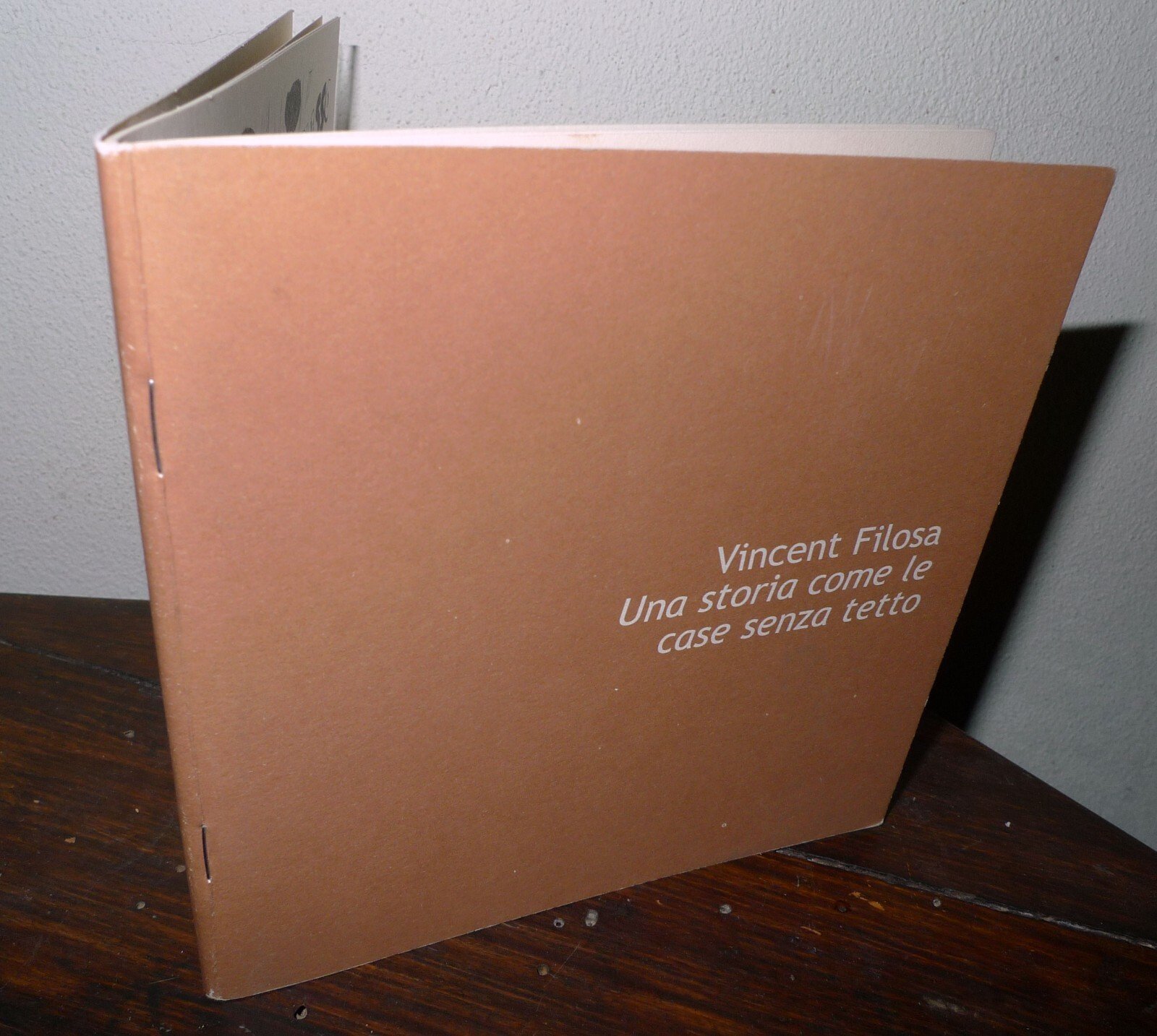 Vincent Filosa,UNA STORIA COME LE CASE SENZA TETTO.Galleria RAM HOTEL, Bologna 2009,brossura, rilegatura con punto metallico,13,5x13,5 cm., pp.32 non numerate,illustrazioni in bianco e nero,testo in italiano ed inglese,peso: g.250cod.9402CONDIZIONI DELL'OPUSCOLO: come nuovo