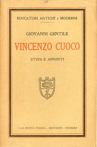 XII, 185 p. ; 21 x 13 cm. Educatori antichi e moderni. Studi sugli scritti pedagogici di Vincenzo Cuoco, in parte precedentemente pubblicati come introduzione ad un'antologia di scritti di Cuoco, pubblicata nel 1909, nella "Rivista pedagogica" del 1908 e in altre occasioni. Brossura editoriale, coperta in cartoncino flessibile con titolo impresso in rosso al piatto e al dorso. Volume intonso. Codice libreria 4872.