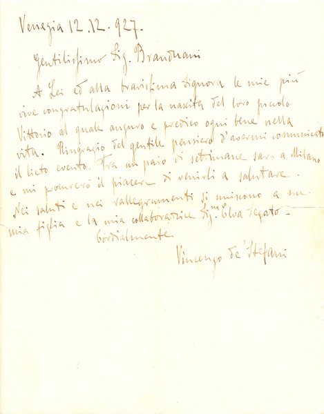 Lettera manoscritta e firmata di Vincenzo de Stefani di 1 facciata a Branduani per la nascita del figlio Vittorio datata 12 Dicembre 1927; minimi strappetti ai margini; buon es.