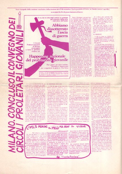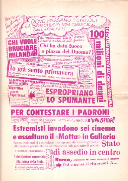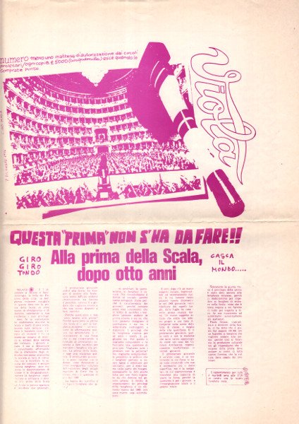 Grande foglio ripiegato (cm44x60) stampato fronte e retro in viola, pagine 4 illustrate. -- Contestazione della prima della Scala. Viola giornale dei Circoli proletari giovanili. I Circoli nascono nell'autunno 1975 occupando chiese sconsacrate, ex fabbriche, caserme dismesse nella periferia milanese. L’esigenza è quella di creare un’alternativa all’emarginazione e alla disgregazione sociale ponendosi come luoghi di incontro,