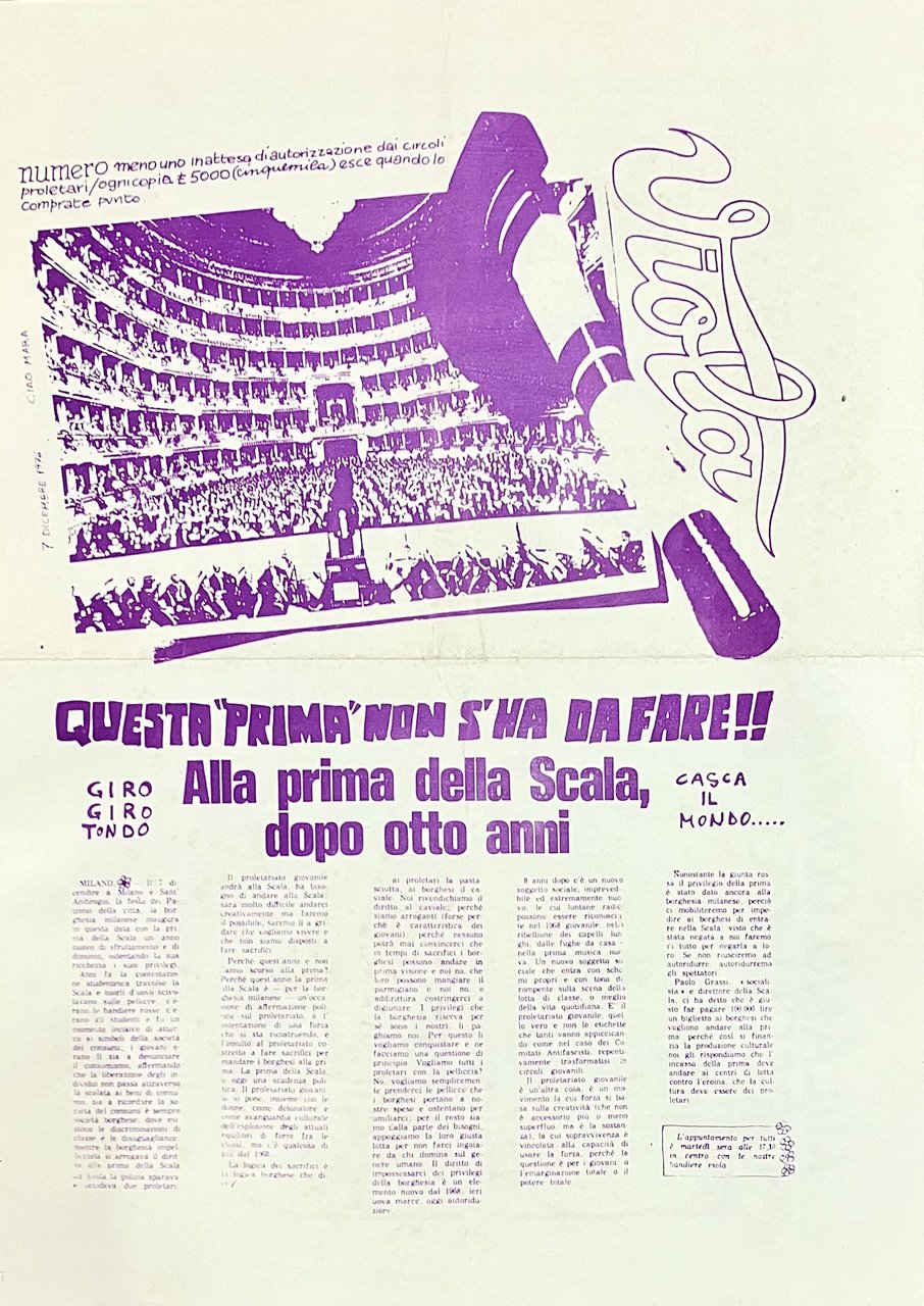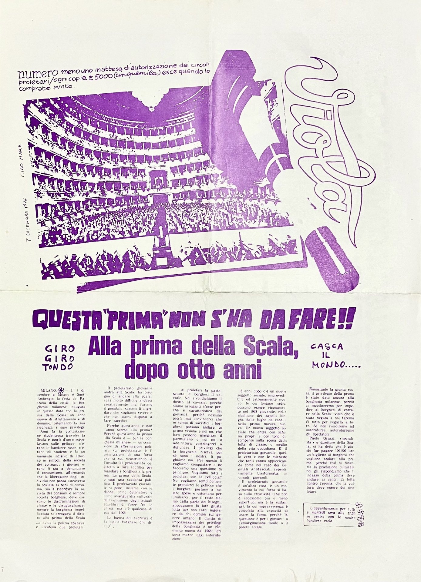 Bifolio stampato in viola. Primo numero della rivista dedicato alla contestazione organizzata dai Circoli del proletariato giovanile: contro la "logica dei sacrifici" e per "il diritto al caviale", un'ascia di guerra minaccia gli impellicciati! Normale piega, in ottimo stato.