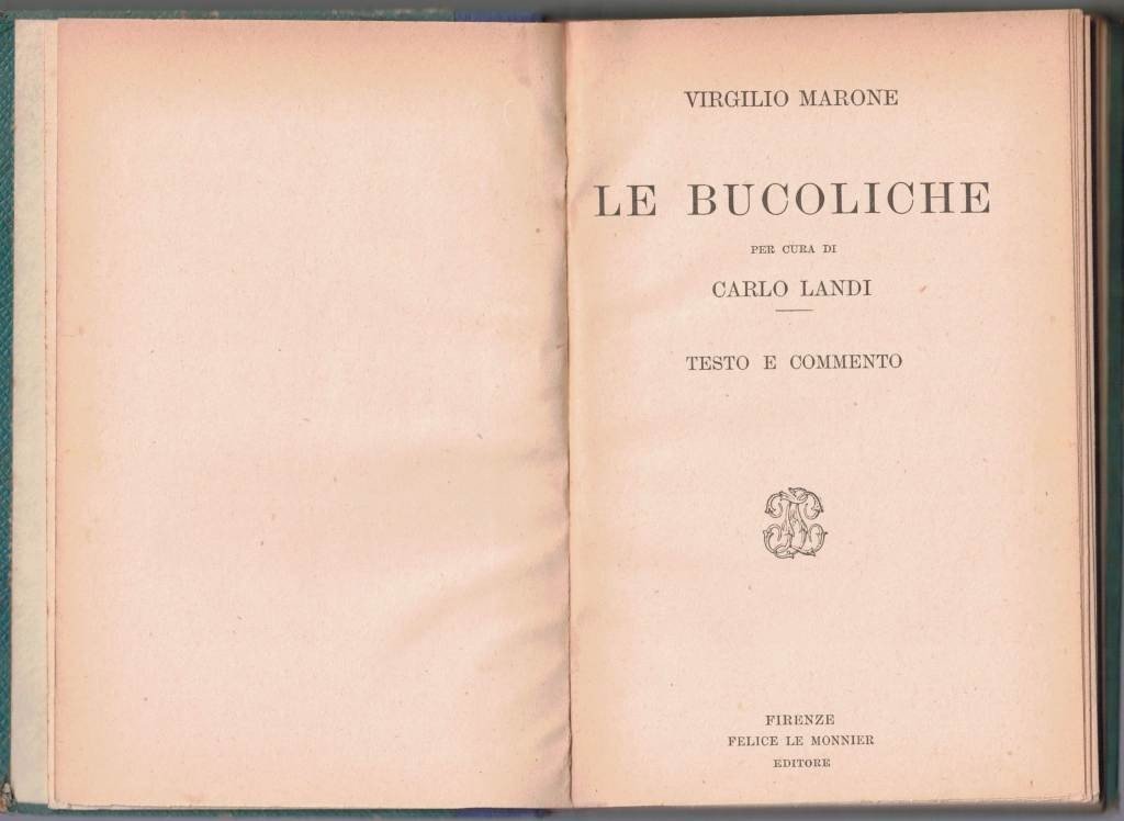 Publio Virgilio Marone (Publius Vergilius Maro), Le Bucoliche, per cura di Carlo Landi. Testo e commento, Felice Le Monnier Editore, Firenze 1925, pp. XXXII, 82, cm 20, legatura coeva in mezza tela blu con titoli manoscritti al dorso. Testo in lingua latina con introduzione, commento e apparati in lingua italiana. Segnatura di collocazione alla prima carta bianca. Qualche sporadico segnetto o annotazione a margine a lapis, qualche rara sottolineatura, minima brunitura della carta, per il resto buon esemplare.