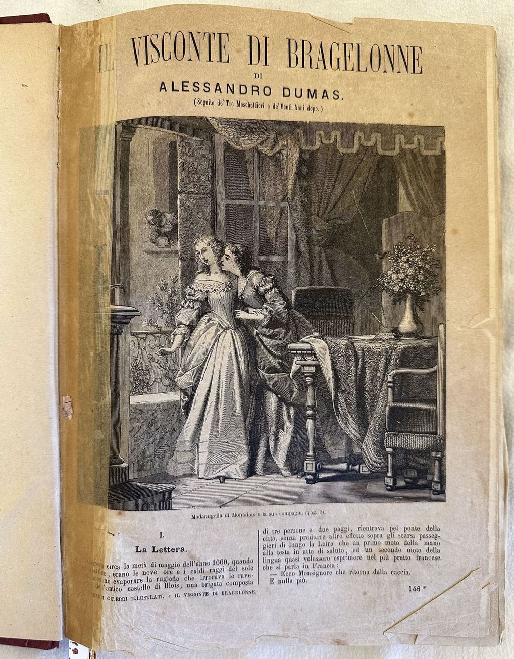 Edizione illustrata della fine dell'ottocento inizi novecento del celebre romanzo di appendice di Axexandre Dumas "Visconte di Bragelonne" seguito de "I tre Moschettieri" edito da "Biblioteca romantica illustrata". Testo italiano L'opera è composta da 75 dispense legate insieme in un volume ed è completa (dalla dispensa 146 alla 220). All'interno numerose illustrazioni nel testo e fuori testo di vari incisori: Decandrè, De Neuville, Roget, Carbonneau ec. In discrete condizioni e completo. Copertina in mezza tela con titolo e decorazioni in oro al dorso in buone condizioni generali con lievi usure ai margini e dorso. Legatura in buone condizioni con qualche pagina in parte staccata. Pagine in discrete condizioni con fioriture e piccoli strappi. Pagine 33, 585, 587, 598 riparate con nastro adesivo con perdita di testo. In . Dim. 30,5x22,5 cm. Pp. 599+(1). Kg. 0,650 Illustrated edition of late 19th century or early 20th century of the famous instalments novel by Alexandre Dumas "Visconte di Bragelonne" following of "I tre Moschettieri" edited by Biblioteca romantica illustrata. italian text. The work is made up of 75 instalments bound together in a unique volume and is complete (from instalment 146 to 220). inside different illustrations in the text of different illustrators: Decandrè, De Neuville, Roget, Carbonneau ec. In fair conditions and complete Half cloth coeval cover with giled title and decorations in the spine in good conditions lightly worn in the extremities. Binding in good conditions with some page detached. Pages in fair conditions with foxing and little tears. Pages 33, 585, 587, 598 repaired with adhesive tape with loss of text. In . Dim. 30,5x22,5 cm. Pp. 599+(1). Kg. 0,650<BR><BR>