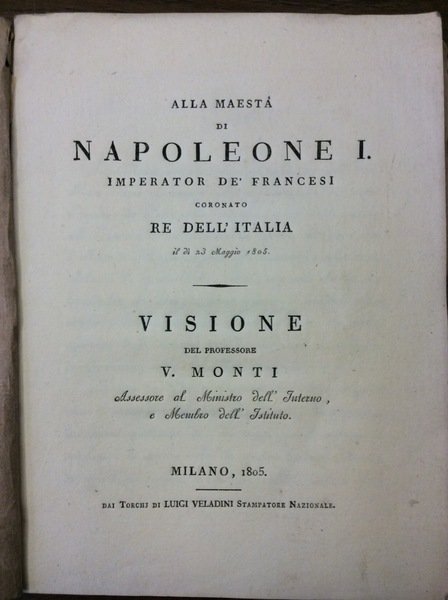In-8 gr. (mm. 257x191), brossura muta coeva, pp. 16; lunga dedica dell'A. a Napoleone. "Edizione originale" (alla pari di altre due, sempre di Veladini, stampate contemporaneamente a questa ma in diverso formato), su carta pesante. Qui il Veladini appone la data errata dell'incoronazione: il 23 maggio invece del 26 maggio. Cfr. Bustico Bibl. di Vincenzo Monti,292. Edizione tipograficamente molto ben curata. Esemplare marginoso, ben conservato.