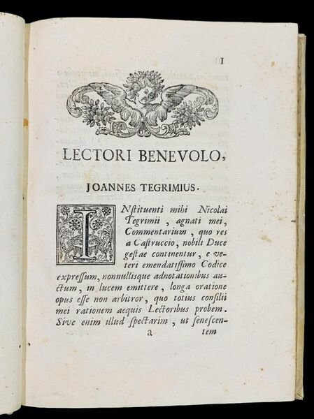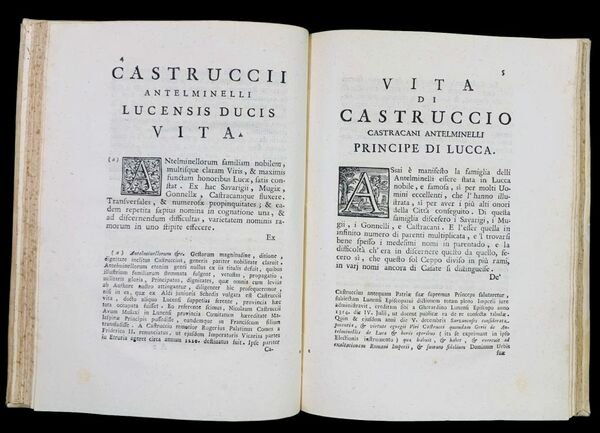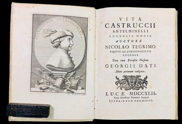 In 4° (22,6x16,4 cm); (4), LXXXIV, 164 pp. e una c. di tavola in antiporta con ritratto Castruccio inciso da Domenico Miserotti. Testo latino con a fronte la traduzione italiana. Terza edizione, seconda in italiano, dopo l'incunabolo del 1496 in latino e l'edizione lucchese del 1556 in italiano. Come però ben specifica il Moreni, II, 387, A questa edizione vi è premessa la vita del Tegrimi scritta in Toscano dal dotto P.Alessandro Berti della Congregazione della Madre di Dio, e vi sono molte opportune note, le quali sono, giusta l'asserzione del D.Lami nelle "Nov. Lett. Fior." all'anno 1742, num. 36, del P. Domenico Mansi poi Arcivescovo di Lucca, il quale ha eziandio tutto il merito di questa elegante edizione". Legatura coeva in piena pergamena rigida. Tagli leggermente spruzzati. Un piccolo tunnel di tarlo al margine esterno bianco di una sessantina di carte, sempre vicino al bordo del foglio ed ininfluente. Nel complesso esemplare in buone condizioni di conservazione. Il testo vero e proprio, in questa edizione, è preceduto da una biografia in italiano dell'autore scritta da Alessandro Pompeo Berti. Segue poi una serie cronologica della vita di Castruccio, questa in latino ed infine, da una prefazione, sempre in latino, del Tegrimi. Questa edizione, rappresenta la più bella e completa vita del celeberrimo condottiero lucchese, Castruccio Castracani degli Antelminelli (Lucca, 29 marzo 1281 Lucca, 3 settembre 1328), scritta dall'intellettuale lucchese, Nicolao Tegrimo (1448 ca. - 1527). L'opera rappresenta la più importante biografia del grande condottiero lucchese Castruccio Castracani degli Antelminelli che fu fu duca di Lucca, signore di Carrara, Lerici, Pisa, Pistoia, Pontremoli e Sarzana e gonfaloniere del Sacro Romano Impero. Appartenente all'importante famiglia ghibellina, Castruccio fu costretto a fuggire da Lucca nel 1300 dopo essere stato cacciato dalla città dalla fazione dei Neri capeggiata da Bonturo Dati. Dopo aver vissuto in esilio a Pisa, si diresse quindi in Inghilterra dove prese parte a diversi tornei, vincendone vari e conoscendo anche Edoardo I d'Inghilterra. In seguito a causa di un omicidio d'onore dovette abbandonare la sua residenza per cercare riparo in Francia, su chiamata diretta di Filippo il Bello che cercava abili uomini d'arme. Filippo gli assegnò un comando in cavalleria e Castruccio si distinse nelle battaglie di Arras e nella difesa di Thérouanne nella Guerra di Fiandra. Nel 1314 si aggregò alle truppe ghibelline di Uguccione della Faggiuola che si muovevano verso l'Italia al seguito di Arrigo VII in Italia. Prese parte alla presa e al successivo sacco di Lucca dove da tempo governavano i Guelfi. Fu uno dei comandanti protagonisti della battaglia di Montecatini il 29 agosto del 1315. Uguccione che iniziò a vedere in lui non un alleato ma un rivale, lo fece imprigionare in attesa di ucciderlo ma una rivolta scoppiata a Lucca e Pisa fece scappare Uguccione. Castruccio venne liberato ed acclamato Capitano Generale prima e Console a vita poi, della città di Lucca. Combatté come comandante di una parte dell'esercito ghibellino nella battaglia di Montecatini (29 agosto 1315) in cui, con l'aiuto dei soldati dell'imperatore, risultò il principale artefice della vittoria sui fiorentini della Lega Guelfa. Gli storici Giovanni Villani, Scipione Ammirato, Niccolò Machiavelli ricordano i danni arrecati da Castruccio e dalle sue truppe al territorio fiorentino, fra cui Empoli. Caduto in disgrazia presso Uguccione, che lo intravide come concorrente per la signoria, fu da questi imprigionato in attesa di essere giustiziato. Tuttavia a seguito di una rivolta popolare a Lucca e Pisa, Uguccione dovette fuggire, Castruccio fu liberato ed acclamato Capitano Generale della città di Lucca, e poco dopo (12 giugno 1316) Console a vita. Dopo aver consolidato la sua signoria sulla città, Castruccio nel 1320, decise che era venuto il momento di espandere il suo potere ed iniziò le ostilità contro i fiorentini. Nel medesimo anno l'arciduca d'Austria Federico I d'Asburgo lo nominò vicario per Lucca, la Lunigiana e la Val di Nievole (in tale incarico, fu confermato, anche, nel 1324, dall'imperatore Ludovico il Bavaro). Seguirono anni di imprese e successi che lo portarono a estendere la sua influenza, su buona parte del territorio toscano. Morì per un'infezione malarica nel 1328, non dopo però di aver disseminato il territorio toscano e ligure ed in particolare, della Lunigiana di fortificazioni e castelli difensivi. Terza e più completa edizione della più importante biografia di Castruccio Castracani, in buone condizioni di conservazione. Rif. Bibl.: Lozzi, I, 2408, "Raro"; Graesse, VII, 46, "E' la più bella edizione di questa interessante vita, prima della traduzione di G. Dati"; G.B.Franceschini, "De vita et scriptis J.D.Mansi", pg.57, dove è datato 1742); Inghirami, II, 196.
