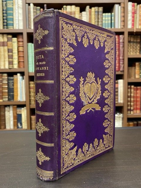 In-8° (cm. 22,7), suggestiva legatura coeva in piena pelle viola, stemma della congregazione religiosa in oro al centro dei piatti inquadrati da doppi filetti ornati da una ricca cornice floreale in oro, dorso liscio con titolo, filetti e fregi in oro (abrasioni al dorso), tagli rossi, risguardi in carta decorata oro; pp. [4] 553 [1] in stato molto buono (sporadiche fioriture); con 6 tavole in nero fuori testo, di cui 1 ritratto del beato all'antiporta. Graziose testatine, capilettera e finalini. Traduzione italiana dal francese di G. Antonelli Costaggini. Non comune. Ottimo esemplare. (SL1)